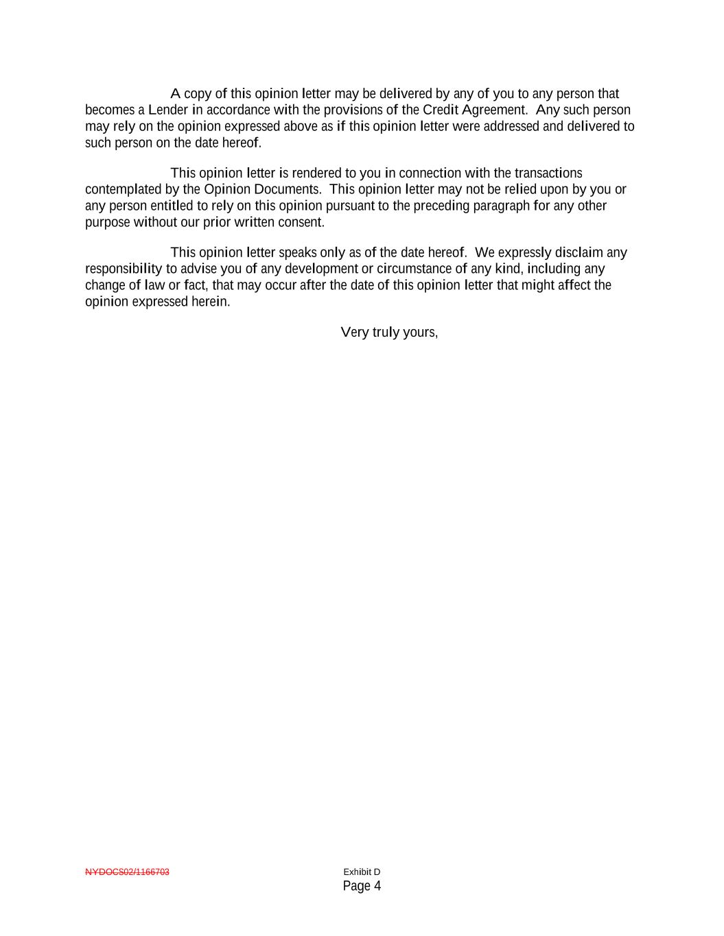 NYDOCS02/1166703 Exhibit D Page 4 A copy of this opinion letter may be delivered by any of you to any person that becomes a Lender in accordance with the provisions of the Credit Agreement. Any such person may rely on the opinion expressed above as if this opinion letter were addressed and delivered to such person on the date hereof. This opinion letter is rendered to you in connection with the transactions contemplated by the Opinion Documents. This opinion letter may not be relied upon by you or any person entitled to rely on this opinion pursuant to the preceding paragraph for any other purpose without our prior written consent. This opinion letter speaks only as of the date hereof. We expressly disclaim any responsibility to advise you of any development or circumstance of any kind, including any change of law or fact, that may occur after the date of this opinion letter that might affect the opinion expressed herein. Very truly yours,
