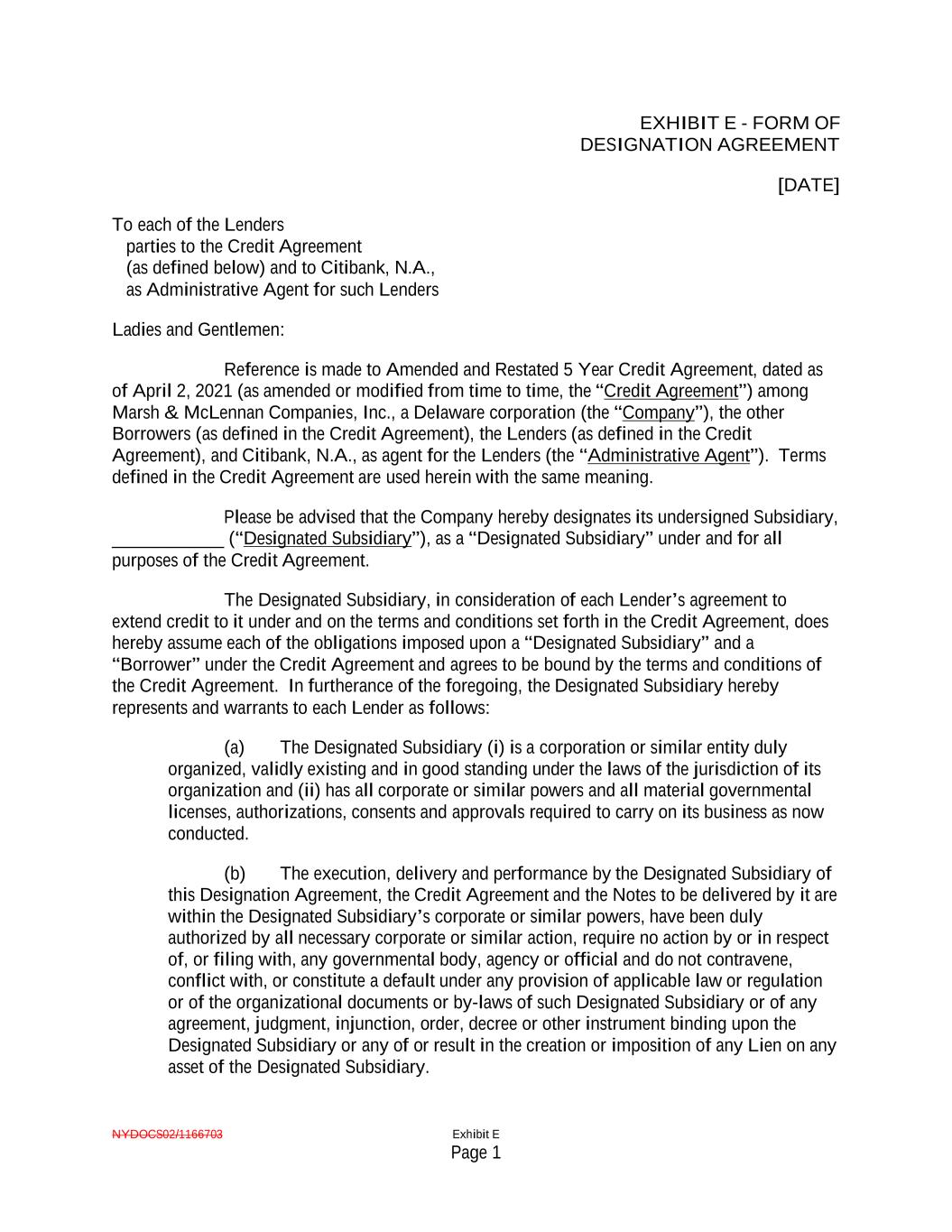 NYDOCS02/1166703 Exhibit E Page 1 EXHIBIT E - FORM OF DESIGNATION AGREEMENT [DATE] To each of the Lenders parties to the Credit Agreement (as defined below) and to Citibank, N.A., as Administrative Agent for such Lenders Ladies and Gentlemen: Reference is made to Amended and Restated 5 Year Credit Agreement, dated as of April 2, 2021 (as amended or modified from time to time, the “Credit Agreement”) among Marsh & McLennan Companies, Inc., a Delaware corporation (the “Company”), the other Borrowers (as defined in the Credit Agreement), the Lenders (as defined in the Credit Agreement), and Citibank, N.A., as agent for the Lenders (the “Administrative Agent”). Terms defined in the Credit Agreement are used herein with the same meaning. Please be advised that the Company hereby designates its undersigned Subsidiary, ____________ (“Designated Subsidiary”), as a “Designated Subsidiary” under and for all purposes of the Credit Agreement. The Designated Subsidiary, in consideration of each Lender’s agreement to extend credit to it under and on the terms and conditions set forth in the Credit Agreement, does hereby assume each of the obligations imposed upon a “Designated Subsidiary” and a “Borrower” under the Credit Agreement and agrees to be bound by the terms and conditions of the Credit Agreement. In furtherance of the foregoing, the Designated Subsidiary hereby represents and warrants to each Lender as follows: (a) The Designated Subsidiary (i) is a corporation or similar entity duly organized, validly existing and in good standing under the laws of the jurisdiction of its organization and (ii) has all corporate or similar powers and all material governmental licenses, authorizations, consents and approvals required to carry on its business as now conducted. (b) The execution, delivery and performance by the Designated Subsidiary of this Designation Agreement, the Credit Agreement and the Notes to be delivered by it are within the Designated Subsidiary’s corporate or similar powers, have been duly authorized by all necessary corporate or similar action, require no action by or in respect of, or filing with, any governmental body, agency or official and do not contravene, conflict with, or constitute a default under any provision of applicable law or regulation or of the organizational documents or by-laws of such Designated Subsidiary or of any agreement, judgment, injunction, order, decree or other instrument binding upon the Designated Subsidiary or any of or result in the creation or imposition of any Lien on any asset of the Designated Subsidiary.