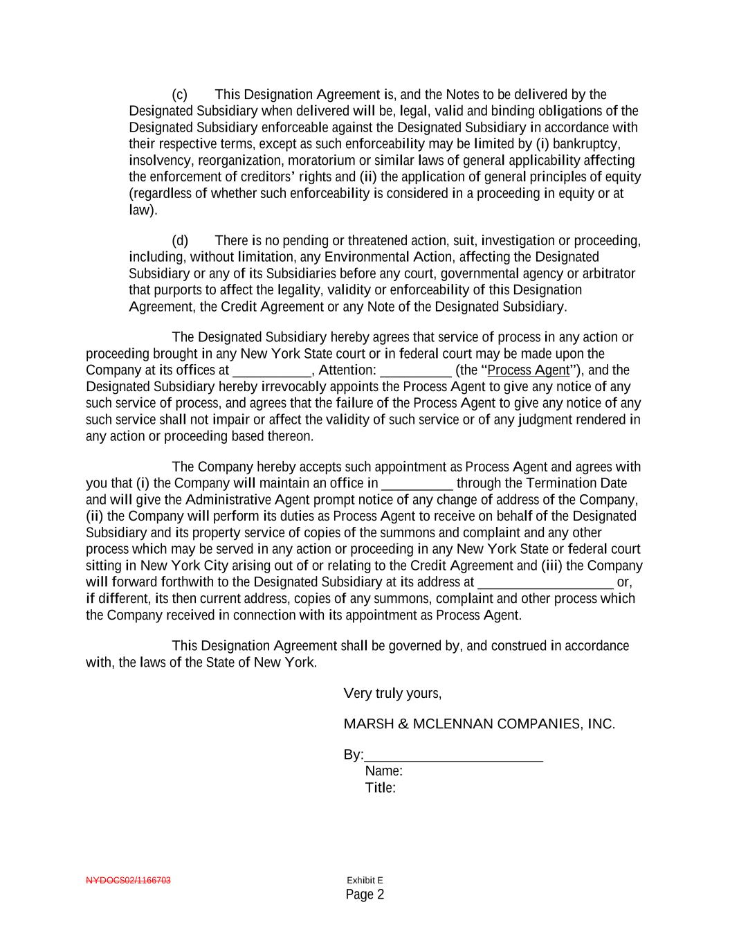 NYDOCS02/1166703 Exhibit E Page 2 (c) This Designation Agreement is, and the Notes to be delivered by the Designated Subsidiary when delivered will be, legal, valid and binding obligations of the Designated Subsidiary enforceable against the Designated Subsidiary in accordance with their respective terms, except as such enforceability may be limited by (i) bankruptcy, insolvency, reorganization, moratorium or similar laws of general applicability affecting the enforcement of creditors’ rights and (ii) the application of general principles of equity (regardless of whether such enforceability is considered in a proceeding in equity or at law). (d) There is no pending or threatened action, suit, investigation or proceeding, including, without limitation, any Environmental Action, affecting the Designated Subsidiary or any of its Subsidiaries before any court, governmental agency or arbitrator that purports to affect the legality, validity or enforceability of this Designation Agreement, the Credit Agreement or any Note of the Designated Subsidiary. The Designated Subsidiary hereby agrees that service of process in any action or proceeding brought in any New York State court or in federal court may be made upon the Company at its offices at ___________, Attention: __________ (the “Process Agent”), and the Designated Subsidiary hereby irrevocably appoints the Process Agent to give any notice of any such service of process, and agrees that the failure of the Process Agent to give any notice of any such service shall not impair or affect the validity of such service or of any judgment rendered in any action or proceeding based thereon. The Company hereby accepts such appointment as Process Agent and agrees with you that (i) the Company will maintain an office in __________ through the Termination Date and will give the Administrative Agent prompt notice of any change of address of the Company, (ii) the Company will perform its duties as Process Agent to receive on behalf of the Designated Subsidiary and its property service of copies of the summons and complaint and any other process which may be served in any action or proceeding in any New York State or federal court sitting in New York City arising out of or relating to the Credit Agreement and (iii) the Company will forward forthwith to the Designated Subsidiary at its address at ___________________ or, if different, its then current address, copies of any summons, complaint and other process which the Company received in connection with its appointment as Process Agent. This Designation Agreement shall be governed by, and construed in accordance with, the laws of the State of New York. Very truly yours, MARSH & MCLENNAN COMPANIES, INC. By:_________________________ Name: Title: