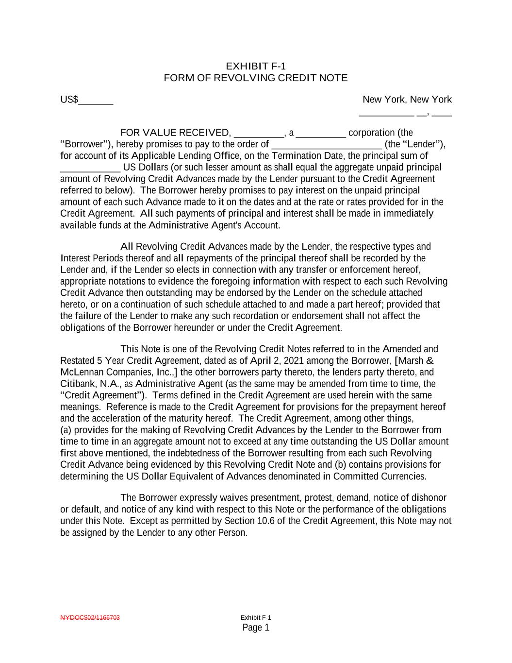 NYDOCS02/1166703 Exhibit F-1 Page 1 EXHIBIT F-1 FORM OF REVOLVING CREDIT NOTE US$_______ New York, New York ___________ __, ____ FOR VALUE RECEIVED, __________, a __________ corporation (the “Borrower”), hereby promises to pay to the order of ______________________ (the “Lender”), for account of its Applicable Lending Office, on the Termination Date, the principal sum of ____________ US Dollars (or such lesser amount as shall equal the aggregate unpaid principal amount of Revolving Credit Advances made by the Lender pursuant to the Credit Agreement referred to below). The Borrower hereby promises to pay interest on the unpaid principal amount of each such Advance made to it on the dates and at the rate or rates provided for in the Credit Agreement. All such payments of principal and interest shall be made in immediately available funds at the Administrative Agent's Account. All Revolving Credit Advances made by the Lender, the respective types and Interest Periods thereof and all repayments of the principal thereof shall be recorded by the Lender and, if the Lender so elects in connection with any transfer or enforcement hereof, appropriate notations to evidence the foregoing information with respect to each such Revolving Credit Advance then outstanding may be endorsed by the Lender on the schedule attached hereto, or on a continuation of such schedule attached to and made a part hereof; provided that the failure of the Lender to make any such recordation or endorsement shall not affect the obligations of the Borrower hereunder or under the Credit Agreement. This Note is one of the Revolving Credit Notes referred to in the Amended and Restated 5 Year Credit Agreement, dated as of April 2, 2021 among the Borrower, [Marsh & McLennan Companies, Inc.,] the other borrowers party thereto, the lenders party thereto, and Citibank, N.A., as Administrative Agent (as the same may be amended from time to time, the “Credit Agreement”). Terms defined in the Credit Agreement are used herein with the same meanings. Reference is made to the Credit Agreement for provisions for the prepayment hereof and the acceleration of the maturity hereof. The Credit Agreement, among other things, (a) provides for the making of Revolving Credit Advances by the Lender to the Borrower from time to time in an aggregate amount not to exceed at any time outstanding the US Dollar amount first above mentioned, the indebtedness of the Borrower resulting from each such Revolving Credit Advance being evidenced by this Revolving Credit Note and (b) contains provisions for determining the US Dollar Equivalent of Advances denominated in Committed Currencies. The Borrower expressly waives presentment, protest, demand, notice of dishonor or default, and notice of any kind with respect to this Note or the performance of the obligations under this Note. Except as permitted by Section 10.6 of the Credit Agreement, this Note may not be assigned by the Lender to any other Person.