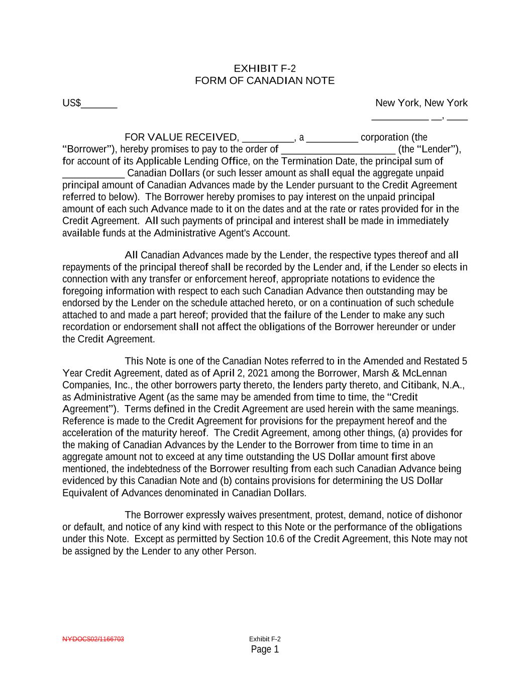 NYDOCS02/1166703 Exhibit F-2 Page 1 EXHIBIT F-2 FORM OF CANADIAN NOTE US$_______ New York, New York ___________ __, ____ FOR VALUE RECEIVED, __________, a __________ corporation (the “Borrower”), hereby promises to pay to the order of ______________________ (the “Lender”), for account of its Applicable Lending Office, on the Termination Date, the principal sum of ____________ Canadian Dollars (or such lesser amount as shall equal the aggregate unpaid principal amount of Canadian Advances made by the Lender pursuant to the Credit Agreement referred to below). The Borrower hereby promises to pay interest on the unpaid principal amount of each such Advance made to it on the dates and at the rate or rates provided for in the Credit Agreement. All such payments of principal and interest shall be made in immediately available funds at the Administrative Agent's Account. All Canadian Advances made by the Lender, the respective types thereof and all repayments of the principal thereof shall be recorded by the Lender and, if the Lender so elects in connection with any transfer or enforcement hereof, appropriate notations to evidence the foregoing information with respect to each such Canadian Advance then outstanding may be endorsed by the Lender on the schedule attached hereto, or on a continuation of such schedule attached to and made a part hereof; provided that the failure of the Lender to make any such recordation or endorsement shall not affect the obligations of the Borrower hereunder or under the Credit Agreement. This Note is one of the Canadian Notes referred to in the Amended and Restated 5 Year Credit Agreement, dated as of April 2, 2021 among the Borrower, Marsh & McLennan Companies, Inc., the other borrowers party thereto, the lenders party thereto, and Citibank, N.A., as Administrative Agent (as the same may be amended from time to time, the “Credit Agreement”). Terms defined in the Credit Agreement are used herein with the same meanings. Reference is made to the Credit Agreement for provisions for the prepayment hereof and the acceleration of the maturity hereof. The Credit Agreement, among other things, (a) provides for the making of Canadian Advances by the Lender to the Borrower from time to time in an aggregate amount not to exceed at any time outstanding the US Dollar amount first above mentioned, the indebtedness of the Borrower resulting from each such Canadian Advance being evidenced by this Canadian Note and (b) contains provisions for determining the US Dollar Equivalent of Advances denominated in Canadian Dollars. The Borrower expressly waives presentment, protest, demand, notice of dishonor or default, and notice of any kind with respect to this Note or the performance of the obligations under this Note. Except as permitted by Section 10.6 of the Credit Agreement, this Note may not be assigned by the Lender to any other Person.