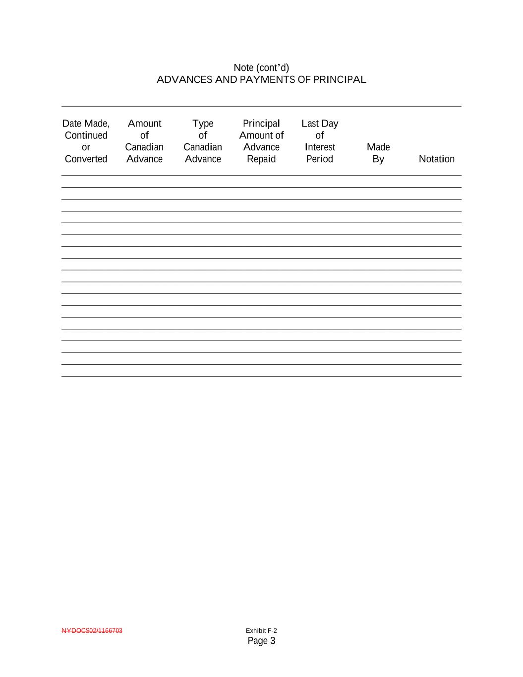 NYDOCS02/1166703 Exhibit F-2 Page 3 Note (cont’d) ADVANCES AND PAYMENTS OF PRINCIPAL Date Made, Continued or Converted Amount of Canadian Advance Type of Canadian Advance Principal Amount of Advance Repaid Last Day of Interest Period Made By Notation ______________________________________________________________________________ ______________________________________________________________________________ ______________________________________________________________________________ ______________________________________________________________________________ ______________________________________________________________________________ ______________________________________________________________________________ ______________________________________________________________________________ ______________________________________________________________________________ ______________________________________________________________________________ ______________________________________________________________________________ ______________________________________________________________________________ ______________________________________________________________________________ ______________________________________________________________________________ ______________________________________________________________________________ ______________________________________________________________________________ ______________________________________________________________________________ ______________________________________________________________________________ ______________________________________________________________________________