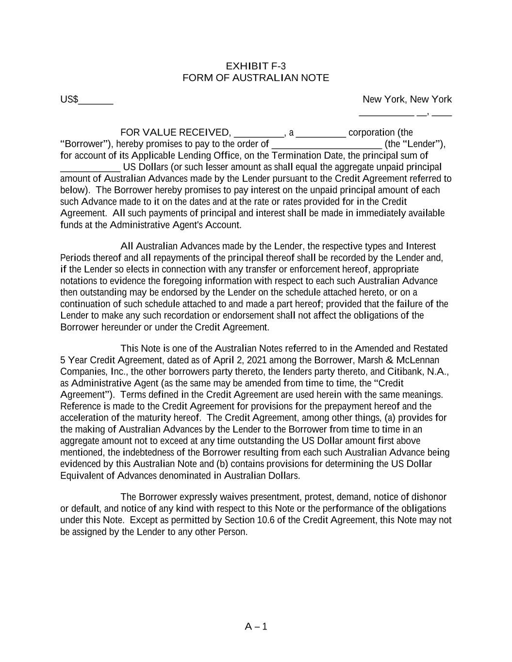 A – 1 EXHIBIT F-3 FORM OF AUSTRALIAN NOTE US$_______ New York, New York ___________ __, ____ FOR VALUE RECEIVED, __________, a __________ corporation (the “Borrower”), hereby promises to pay to the order of ______________________ (the “Lender”), for account of its Applicable Lending Office, on the Termination Date, the principal sum of ____________ US Dollars (or such lesser amount as shall equal the aggregate unpaid principal amount of Australian Advances made by the Lender pursuant to the Credit Agreement referred to below). The Borrower hereby promises to pay interest on the unpaid principal amount of each such Advance made to it on the dates and at the rate or rates provided for in the Credit Agreement. All such payments of principal and interest shall be made in immediately available funds at the Administrative Agent's Account. All Australian Advances made by the Lender, the respective types and Interest Periods thereof and all repayments of the principal thereof shall be recorded by the Lender and, if the Lender so elects in connection with any transfer or enforcement hereof, appropriate notations to evidence the foregoing information with respect to each such Australian Advance then outstanding may be endorsed by the Lender on the schedule attached hereto, or on a continuation of such schedule attached to and made a part hereof; provided that the failure of the Lender to make any such recordation or endorsement shall not affect the obligations of the Borrower hereunder or under the Credit Agreement. This Note is one of the Australian Notes referred to in the Amended and Restated 5 Year Credit Agreement, dated as of April 2, 2021 among the Borrower, Marsh & McLennan Companies, Inc., the other borrowers party thereto, the lenders party thereto, and Citibank, N.A., as Administrative Agent (as the same may be amended from time to time, the “Credit Agreement”). Terms defined in the Credit Agreement are used herein with the same meanings. Reference is made to the Credit Agreement for provisions for the prepayment hereof and the acceleration of the maturity hereof. The Credit Agreement, among other things, (a) provides for the making of Australian Advances by the Lender to the Borrower from time to time in an aggregate amount not to exceed at any time outstanding the US Dollar amount first above mentioned, the indebtedness of the Borrower resulting from each such Australian Advance being evidenced by this Australian Note and (b) contains provisions for determining the US Dollar Equivalent of Advances denominated in Australian Dollars. The Borrower expressly waives presentment, protest, demand, notice of dishonor or default, and notice of any kind with respect to this Note or the performance of the obligations under this Note. Except as permitted by Section 10.6 of the Credit Agreement, this Note may not be assigned by the Lender to any other Person.