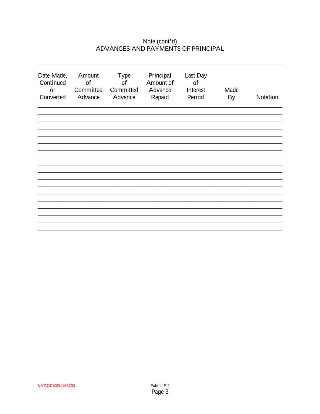 NYDOCS02/1166703 Exhibit F-2 Page 3 Note (cont’d) ADVANCES AND PAYMENTS OF PRINCIPAL Date Made, Continued or Converted Amount of Committed Advance Type of Committed Advance Principal Amount of Advance Repaid Last Day of Interest Period Made By Notation ______________________________________________________________________________ ______________________________________________________________________________ ______________________________________________________________________________ ______________________________________________________________________________ ______________________________________________________________________________ ______________________________________________________________________________ ______________________________________________________________________________ ______________________________________________________________________________ ______________________________________________________________________________ ______________________________________________________________________________ ______________________________________________________________________________ ______________________________________________________________________________ ______________________________________________________________________________ ______________________________________________________________________________ ______________________________________________________________________________ ______________________________________________________________________________ ______________________________________________________________________________ ______________________________________________________________________________