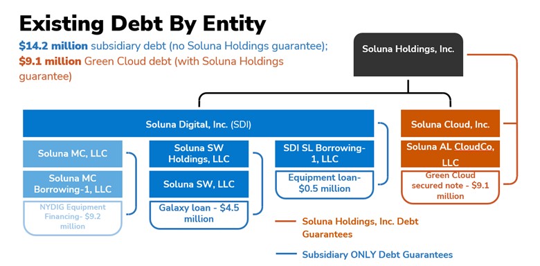 As of June 30, 2025, we had a consolidated accumulated deficit of approximately $329.2 million and we had negative working capital of approximately $30.9 million. As of June 30, 2025, we had total debt outstanding of approximately $23.3 million as summarized further below in the Debt table. In addition, we had outstanding commitments related to Soluna Digital Inc. (“SDI”) of approximately $10.1 million in capital expenditures mainly related to Project Dorothy 2 and Project Kati. In addition, due to CloudCo’s termination of the HPE Agreement on March 24, 2025, and HPE’s termination of the HPE Agreement on March 26, 2025, and the acceleration of the remaining unpaid amounts of the contract in accordance with the HPE Agreement, we have recognized a liability for the remainder of the HPE Agreement on the consolidated balance sheet of approximately $19.3 million. As of June 30, 2025, we had $9.9 million of cash available to fund our operations.