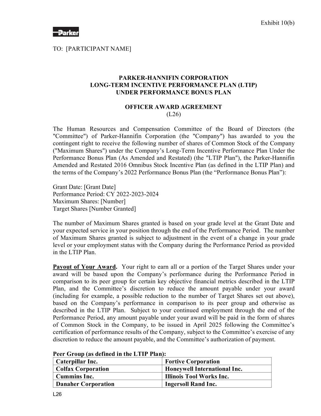 Exhibit 10(b) L26 TO: [PARTICIPANT NAME] PARKER-HANNIFIN CORPORATION LONG-TERM INCENTIVE PERFORMANCE PLAN (LTIP) UNDER PERFORMANCE BONUS PLAN OFFICER AWARD AGREEMENT (L26) The Human Resources and Compensation Committee of the Board of Directors (the "Committee") of Parker-Hannifin Corporation (the "Company") has awarded to you the contingent right to receive the following number of shares of Common Stock of the Company ("Maximum Shares") under the Company’s Long-Term Incentive Performance Plan Under the Performance Bonus Plan (As Amended and Restated) (the "LTIP Plan"), the Parker-Hannifin Amended and Restated 2016 Omnibus Stock Incentive Plan (as defined in the LTIP Plan) and the terms of the Company’s 2022 Performance Bonus Plan (the “Performance Bonus Plan”): Grant Date: [Grant Date] Performance Period: CY 2022-2023-2024 Maximum Shares: [Number] Target Shares [Number Granted] The number of Maximum Shares granted is based on your grade level at the Grant Date and your expected service in your position through the end of the Performance Period. The number of Maximum Shares granted is subject to adjustment in the event of a change in your grade level or your employment status with the Company during the Performance Period as provided in the LTIP Plan. Payout of Your Award. Your right to earn all or a portion of the Target Shares under your award will be based upon the Company’s performance during the Performance Period in comparison to its peer group for certain key objective financial metrics described in the LTIP Plan, and the Committee’s discretion to reduce the amount payable under your award (including for example, a possible reduction to the number of Target Shares set out above), based on the Company’s performance in comparison to its peer group and otherwise as described in the LTIP Plan. Subject to your continued employment through the end of the Performance Period, any amount payable under your award will be paid in the form of shares of Common Stock in the Company, to be issued in April 2025 following the Committee’s certification of performance results of the Company, subject to the Committee’s exercise of any discretion to reduce the amount payable, and the Committee’s authorization of payment. Peer Group (as defined in the LTIP Plan): Caterpillar Inc. Fortive Corporation Colfax Corporation Honeywell International Inc. Cummins Inc. Illinois Tool Works Inc. Danaher Corporation Ingersoll Rand Inc.