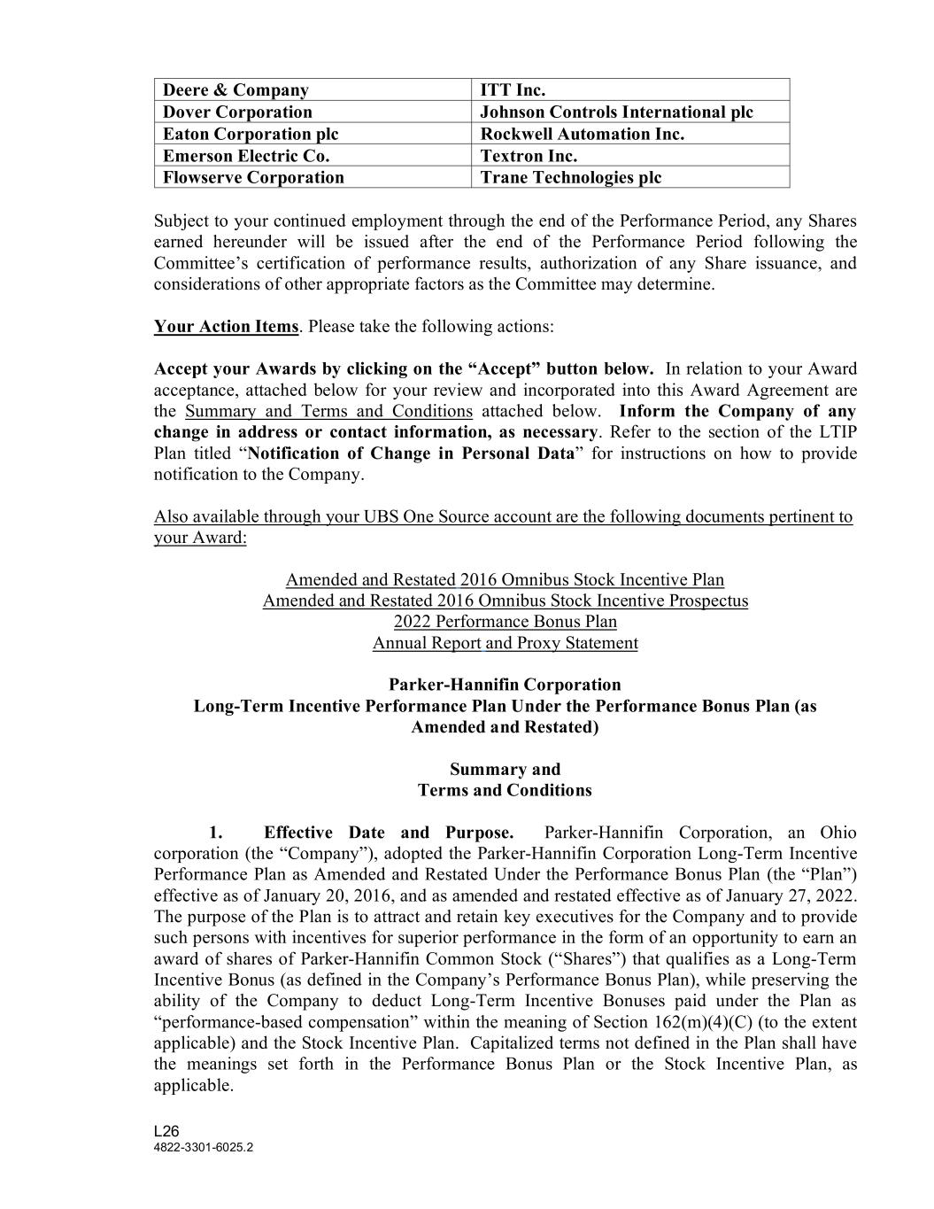 L26 4822-3301-6025.2 Deere & Company ITT Inc. Dover Corporation Johnson Controls International plc Eaton Corporation plc Rockwell Automation Inc. Emerson Electric Co. Textron Inc. Flowserve Corporation Trane Technologies plc Subject to your continued employment through the end of the Performance Period, any Shares earned hereunder will be issued after the end of the Performance Period following the Committee’s certification of performance results, authorization of any Share issuance, and considerations of other appropriate factors as the Committee may determine. Your Action Items. Please take the following actions: Accept your Awards by clicking on the “Accept” button below. In relation to your Award acceptance, attached below for your review and incorporated into this Award Agreement are the Summary and Terms and Conditions attached below. Inform the Company of any change in address or contact information, as necessary. Refer to the section of the LTIP Plan titled “Notification of Change in Personal Data” for instructions on how to provide notification to the Company. Also available through your UBS One Source account are the following documents pertinent to your Award: Amended and Restated 2016 Omnibus Stock Incentive Plan Amended and Restated 2016 Omnibus Stock Incentive Prospectus 2022 Performance Bonus Plan Annual Report and Proxy Statement Parker-Hannifin Corporation Long-Term Incentive Performance Plan Under the Performance Bonus Plan (as Amended and Restated) Summary and Terms and Conditions 1. Effective Date and Purpose. Parker-Hannifin Corporation, an Ohio corporation (the “Company”), adopted the Parker-Hannifin Corporation Long-Term Incentive Performance Plan as Amended and Restated Under the Performance Bonus Plan (the “Plan”) effective as of January 20, 2016, and as amended and restated effective as of January 27, 2022. The purpose of the Plan is to attract and retain key executives for the Company and to provide such persons with incentives for superior performance in the form of an opportunity to earn an award of shares of Parker-Hannifin Common Stock (“Shares”) that qualifies as a Long-Term Incentive Bonus (as defined in the Company’s Performance Bonus Plan), while preserving the ability of the Company to deduct Long-Term Incentive Bonuses paid under the Plan as “performance-based compensation” within the meaning of Section 162(m)(4)(C) (to the extent applicable) and the Stock Incentive Plan. Capitalized terms not defined in the Plan shall have the meanings set forth in the Performance Bonus Plan or the Stock Incentive Plan, as applicable.