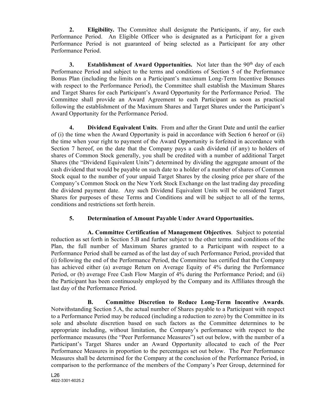 L26 4822-3301-6025.2 2. Eligibility. The Committee shall designate the Participants, if any, for each Performance Period. An Eligible Officer who is designated as a Participant for a given Performance Period is not guaranteed of being selected as a Participant for any other Performance Period. 3. Establishment of Award Opportunities. Not later than the 90th day of each Performance Period and subject to the terms and conditions of Section 5 of the Performance Bonus Plan (including the limits on a Participant’s maximum Long-Term Incentive Bonuses with respect to the Performance Period), the Committee shall establish the Maximum Shares and Target Shares for each Participant’s Award Opportunity for the Performance Period. The Committee shall provide an Award Agreement to each Participant as soon as practical following the establishment of the Maximum Shares and Target Shares under the Participant’s Award Opportunity for the Performance Period. 4. Dividend Equivalent Units. From and after the Grant Date and until the earlier of (i) the time when the Award Opportunity is paid in accordance with Section 6 hereof or (ii) the time when your right to payment of the Award Opportunity is forfeited in accordance with Section 7 hereof, on the date that the Company pays a cash dividend (if any) to holders of shares of Common Stock generally, you shall be credited with a number of additional Target Shares (the “Dividend Equivalent Units”) determined by dividing the aggregate amount of the cash dividend that would be payable on such date to a holder of a number of shares of Common Stock equal to the number of your unpaid Target Shares by the closing price per share of the Company’s Common Stock on the New York Stock Exchange on the last trading day preceding the dividend payment date. Any such Dividend Equivalent Units will be considered Target Shares for purposes of these Terms and Conditions and will be subject to all of the terms, conditions and restrictions set forth herein. 5. Determination of Amount Payable Under Award Opportunities. A. Committee Certification of Management Objectives. Subject to potential reduction as set forth in Section 5.B and further subject to the other terms and conditions of the Plan, the full number of Maximum Shares granted to a Participant with respect to a Performance Period shall be earned as of the last day of such Performance Period, provided that (i) following the end of the Performance Period, the Committee has certified that the Company has achieved either (a) average Return on Average Equity of 4% during the Performance Period, or (b) average Free Cash Flow Margin of 4% during the Performance Period; and (ii) the Participant has been continuously employed by the Company and its Affiliates through the last day of the Performance Period. B. Committee Discretion to Reduce Long-Term Incentive Awards. Notwithstanding Section 5.A, the actual number of Shares payable to a Participant with respect to a Performance Period may be reduced (including a reduction to zero) by the Committee in its sole and absolute discretion based on such factors as the Committee determines to be appropriate including, without limitation, the Company’s performance with respect to the performance measures (the “Peer Performance Measures”) set out below, with the number of a Participant’s Target Shares under an Award Opportunity allocated to each of the Peer Performance Measures in proportion to the percentages set out below. The Peer Performance Measures shall be determined for the Company at the conclusion of the Performance Period, in comparison to the performance of the members of the Company’s Peer Group, determined for