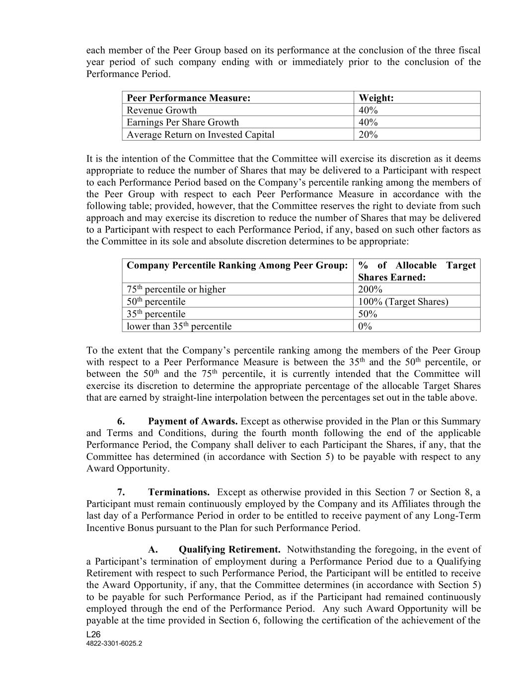 L26 4822-3301-6025.2 each member of the Peer Group based on its performance at the conclusion of the three fiscal year period of such company ending with or immediately prior to the conclusion of the Performance Period. Peer Performance Measure: Weight: Revenue Growth 40% Earnings Per Share Growth 40% Average Return on Invested Capital 20% It is the intention of the Committee that the Committee will exercise its discretion as it deems appropriate to reduce the number of Shares that may be delivered to a Participant with respect to each Performance Period based on the Company’s percentile ranking among the members of the Peer Group with respect to each Peer Performance Measure in accordance with the following table; provided, however, that the Committee reserves the right to deviate from such approach and may exercise its discretion to reduce the number of Shares that may be delivered to a Participant with respect to each Performance Period, if any, based on such other factors as the Committee in its sole and absolute discretion determines to be appropriate: Company Percentile Ranking Among Peer Group: % of Allocable Target Shares Earned: 75th percentile or higher 200% 50th percentile 100% (Target Shares) 35th percentile 50% lower than 35th percentile 0% To the extent that the Company’s percentile ranking among the members of the Peer Group with respect to a Peer Performance Measure is between the 35th and the 50th percentile, or between the 50th and the 75th percentile, it is currently intended that the Committee will exercise its discretion to determine the appropriate percentage of the allocable Target Shares that are earned by straight-line interpolation between the percentages set out in the table above. 6. Payment of Awards. Except as otherwise provided in the Plan or this Summary and Terms and Conditions, during the fourth month following the end of the applicable Performance Period, the Company shall deliver to each Participant the Shares, if any, that the Committee has determined (in accordance with Section 5) to be payable with respect to any Award Opportunity. 7. Terminations. Except as otherwise provided in this Section 7 or Section 8, a Participant must remain continuously employed by the Company and its Affiliates through the last day of a Performance Period in order to be entitled to receive payment of any Long-Term Incentive Bonus pursuant to the Plan for such Performance Period. A. Qualifying Retirement. Notwithstanding the foregoing, in the event of a Participant’s termination of employment during a Performance Period due to a Qualifying Retirement with respect to such Performance Period, the Participant will be entitled to receive the Award Opportunity, if any, that the Committee determines (in accordance with Section 5) to be payable for such Performance Period, as if the Participant had remained continuously employed through the end of the Performance Period. Any such Award Opportunity will be payable at the time provided in Section 6, following the certification of the achievement of the