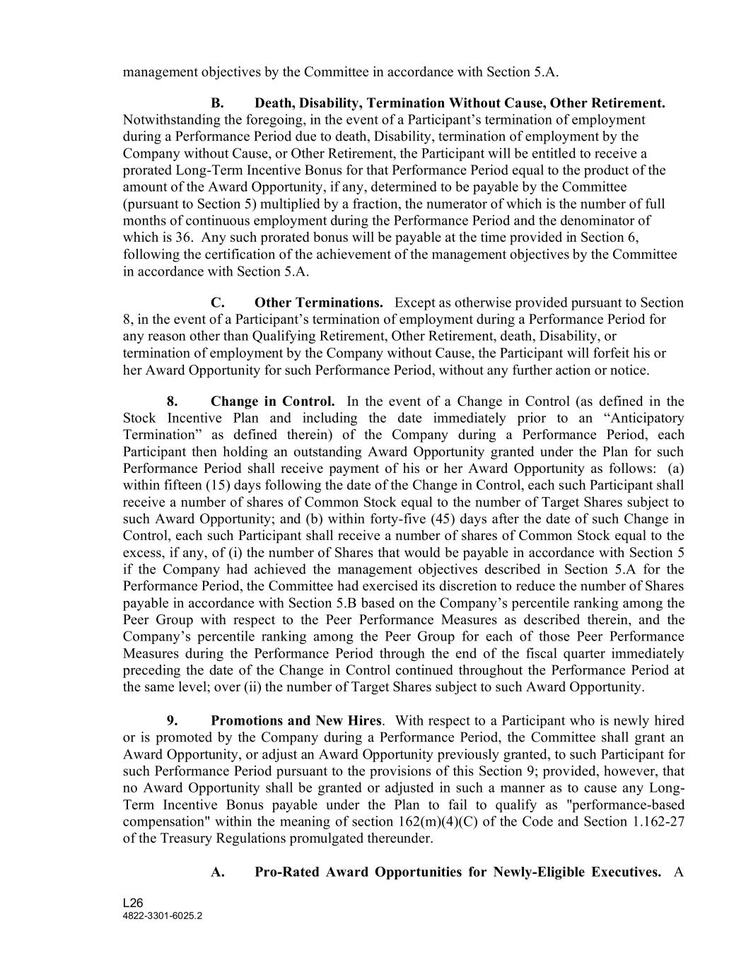 L26 4822-3301-6025.2 management objectives by the Committee in accordance with Section 5.A. B. Death, Disability, Termination Without Cause, Other Retirement. Notwithstanding the foregoing, in the event of a Participant’s termination of employment during a Performance Period due to death, Disability, termination of employment by the Company without Cause, or Other Retirement, the Participant will be entitled to receive a prorated Long-Term Incentive Bonus for that Performance Period equal to the product of the amount of the Award Opportunity, if any, determined to be payable by the Committee (pursuant to Section 5) multiplied by a fraction, the numerator of which is the number of full months of continuous employment during the Performance Period and the denominator of which is 36. Any such prorated bonus will be payable at the time provided in Section 6, following the certification of the achievement of the management objectives by the Committee in accordance with Section 5.A. C. Other Terminations. Except as otherwise provided pursuant to Section 8, in the event of a Participant’s termination of employment during a Performance Period for any reason other than Qualifying Retirement, Other Retirement, death, Disability, or termination of employment by the Company without Cause, the Participant will forfeit his or her Award Opportunity for such Performance Period, without any further action or notice. 8. Change in Control. In the event of a Change in Control (as defined in the Stock Incentive Plan and including the date immediately prior to an “Anticipatory Termination” as defined therein) of the Company during a Performance Period, each Participant then holding an outstanding Award Opportunity granted under the Plan for such Performance Period shall receive payment of his or her Award Opportunity as follows: (a) within fifteen (15) days following the date of the Change in Control, each such Participant shall receive a number of shares of Common Stock equal to the number of Target Shares subject to such Award Opportunity; and (b) within forty-five (45) days after the date of such Change in Control, each such Participant shall receive a number of shares of Common Stock equal to the excess, if any, of (i) the number of Shares that would be payable in accordance with Section 5 if the Company had achieved the management objectives described in Section 5.A for the Performance Period, the Committee had exercised its discretion to reduce the number of Shares payable in accordance with Section 5.B based on the Company’s percentile ranking among the Peer Group with respect to the Peer Performance Measures as described therein, and the Company’s percentile ranking among the Peer Group for each of those Peer Performance Measures during the Performance Period through the end of the fiscal quarter immediately preceding the date of the Change in Control continued throughout the Performance Period at the same level; over (ii) the number of Target Shares subject to such Award Opportunity. 9. Promotions and New Hires. With respect to a Participant who is newly hired or is promoted by the Company during a Performance Period, the Committee shall grant an Award Opportunity, or adjust an Award Opportunity previously granted, to such Participant for such Performance Period pursuant to the provisions of this Section 9; provided, however, that no Award Opportunity shall be granted or adjusted in such a manner as to cause any Long- Term Incentive Bonus payable under the Plan to fail to qualify as "performance-based compensation" within the meaning of section 162(m)(4)(C) of the Code and Section 1.162-27 of the Treasury Regulations promulgated thereunder. A. Pro-Rated Award Opportunities for Newly-Eligible Executives. A