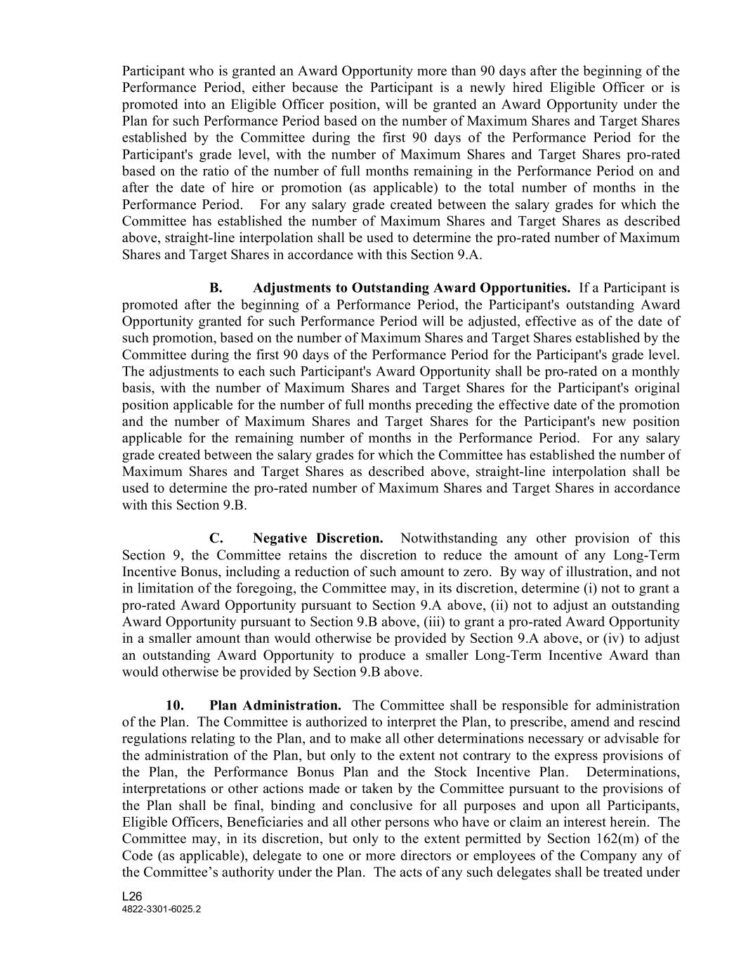 L26 4822-3301-6025.2 Participant who is granted an Award Opportunity more than 90 days after the beginning of the Performance Period, either because the Participant is a newly hired Eligible Officer or is promoted into an Eligible Officer position, will be granted an Award Opportunity under the Plan for such Performance Period based on the number of Maximum Shares and Target Shares established by the Committee during the first 90 days of the Performance Period for the Participant's grade level, with the number of Maximum Shares and Target Shares pro-rated based on the ratio of the number of full months remaining in the Performance Period on and after the date of hire or promotion (as applicable) to the total number of months in the Performance Period. For any salary grade created between the salary grades for which the Committee has established the number of Maximum Shares and Target Shares as described above, straight-line interpolation shall be used to determine the pro-rated number of Maximum Shares and Target Shares in accordance with this Section 9.A. B. Adjustments to Outstanding Award Opportunities. If a Participant is promoted after the beginning of a Performance Period, the Participant's outstanding Award Opportunity granted for such Performance Period will be adjusted, effective as of the date of such promotion, based on the number of Maximum Shares and Target Shares established by the Committee during the first 90 days of the Performance Period for the Participant's grade level. The adjustments to each such Participant's Award Opportunity shall be pro-rated on a monthly basis, with the number of Maximum Shares and Target Shares for the Participant's original position applicable for the number of full months preceding the effective date of the promotion and the number of Maximum Shares and Target Shares for the Participant's new position applicable for the remaining number of months in the Performance Period. For any salary grade created between the salary grades for which the Committee has established the number of Maximum Shares and Target Shares as described above, straight-line interpolation shall be used to determine the pro-rated number of Maximum Shares and Target Shares in accordance with this Section 9.B. C. Negative Discretion. Notwithstanding any other provision of this Section 9, the Committee retains the discretion to reduce the amount of any Long-Term Incentive Bonus, including a reduction of such amount to zero. By way of illustration, and not in limitation of the foregoing, the Committee may, in its discretion, determine (i) not to grant a pro-rated Award Opportunity pursuant to Section 9.A above, (ii) not to adjust an outstanding Award Opportunity pursuant to Section 9.B above, (iii) to grant a pro-rated Award Opportunity in a smaller amount than would otherwise be provided by Section 9.A above, or (iv) to adjust an outstanding Award Opportunity to produce a smaller Long-Term Incentive Award than would otherwise be provided by Section 9.B above. 10. Plan Administration. The Committee shall be responsible for administration of the Plan. The Committee is authorized to interpret the Plan, to prescribe, amend and rescind regulations relating to the Plan, and to make all other determinations necessary or advisable for the administration of the Plan, but only to the extent not contrary to the express provisions of the Plan, the Performance Bonus Plan and the Stock Incentive Plan. Determinations, interpretations or other actions made or taken by the Committee pursuant to the provisions of the Plan shall be final, binding and conclusive for all purposes and upon all Participants, Eligible Officers, Beneficiaries and all other persons who have or claim an interest herein. The Committee may, in its discretion, but only to the extent permitted by Section 162(m) of the Code (as applicable), delegate to one or more directors or employees of the Company any of the Committee’s authority under the Plan. The acts of any such delegates shall be treated under
