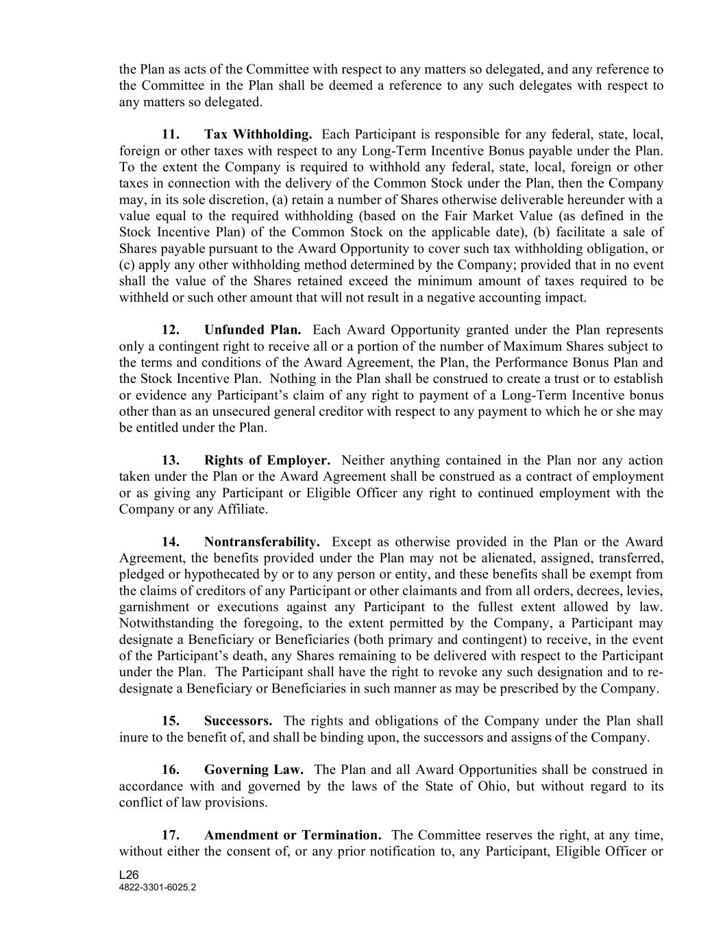 L26 4822-3301-6025.2 the Plan as acts of the Committee with respect to any matters so delegated, and any reference to the Committee in the Plan shall be deemed a reference to any such delegates with respect to any matters so delegated. 11. Tax Withholding. Each Participant is responsible for any federal, state, local, foreign or other taxes with respect to any Long-Term Incentive Bonus payable under the Plan. To the extent the Company is required to withhold any federal, state, local, foreign or other taxes in connection with the delivery of the Common Stock under the Plan, then the Company may, in its sole discretion, (a) retain a number of Shares otherwise deliverable hereunder with a value equal to the required withholding (based on the Fair Market Value (as defined in the Stock Incentive Plan) of the Common Stock on the applicable date), (b) facilitate a sale of Shares payable pursuant to the Award Opportunity to cover such tax withholding obligation, or (c) apply any other withholding method determined by the Company; provided that in no event shall the value of the Shares retained exceed the minimum amount of taxes required to be withheld or such other amount that will not result in a negative accounting impact. 12. Unfunded Plan. Each Award Opportunity granted under the Plan represents only a contingent right to receive all or a portion of the number of Maximum Shares subject to the terms and conditions of the Award Agreement, the Plan, the Performance Bonus Plan and the Stock Incentive Plan. Nothing in the Plan shall be construed to create a trust or to establish or evidence any Participant’s claim of any right to payment of a Long-Term Incentive bonus other than as an unsecured general creditor with respect to any payment to which he or she may be entitled under the Plan. 13. Rights of Employer. Neither anything contained in the Plan nor any action taken under the Plan or the Award Agreement shall be construed as a contract of employment or as giving any Participant or Eligible Officer any right to continued employment with the Company or any Affiliate. 14. Nontransferability. Except as otherwise provided in the Plan or the Award Agreement, the benefits provided under the Plan may not be alienated, assigned, transferred, pledged or hypothecated by or to any person or entity, and these benefits shall be exempt from the claims of creditors of any Participant or other claimants and from all orders, decrees, levies, garnishment or executions against any Participant to the fullest extent allowed by law. Notwithstanding the foregoing, to the extent permitted by the Company, a Participant may designate a Beneficiary or Beneficiaries (both primary and contingent) to receive, in the event of the Participant’s death, any Shares remaining to be delivered with respect to the Participant under the Plan. The Participant shall have the right to revoke any such designation and to re- designate a Beneficiary or Beneficiaries in such manner as may be prescribed by the Company. 15. Successors. The rights and obligations of the Company under the Plan shall inure to the benefit of, and shall be binding upon, the successors and assigns of the Company. 16. Governing Law. The Plan and all Award Opportunities shall be construed in accordance with and governed by the laws of the State of Ohio, but without regard to its conflict of law provisions. 17. Amendment or Termination. The Committee reserves the right, at any time, without either the consent of, or any prior notification to, any Participant, Eligible Officer or