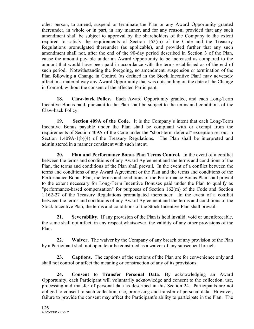 L26 4822-3301-6025.2 other person, to amend, suspend or terminate the Plan or any Award Opportunity granted thereunder, in whole or in part, in any manner, and for any reason; provided that any such amendment shall be subject to approval by the shareholders of the Company to the extent required to satisfy the requirements of Section 162(m) of the Code and the Treasury Regulations promulgated thereunder (as applicable), and provided further that any such amendment shall not, after the end of the 90-day period described in Section 3 of the Plan, cause the amount payable under an Award Opportunity to be increased as compared to the amount that would have been paid in accordance with the terms established as of the end of such period. Notwithstanding the foregoing, no amendment, suspension or termination of the Plan following a Change in Control (as defined in the Stock Incentive Plan) may adversely affect in a material way any Award Opportunity that was outstanding on the date of the Change in Control, without the consent of the affected Participant. 18. Claw-back Policy. Each Award Opportunity granted, and each Long-Term Incentive Bonus paid, pursuant to the Plan shall be subject to the terms and conditions of the Claw-back Policy. 19. Section 409A of the Code. It is the Company’s intent that each Long-Term Incentive Bonus payable under the Plan shall be compliant with or exempt from the requirements of Section 409A of the Code under the “short-term deferral” exception set out in Section 1.409A-1(b)(4) of the Treasury Regulations. The Plan shall be interpreted and administered in a manner consistent with such intent. 20. Plan and Performance Bonus Plan Terms Control. In the event of a conflict between the terms and conditions of any Award Agreement and the terms and conditions of the Plan, the terms and conditions of the Plan shall prevail. In the event of a conflict between the terms and conditions of any Award Agreement or the Plan and the terms and conditions of the Performance Bonus Plan, the terms and conditions of the Performance Bonus Plan shall prevail to the extent necessary for Long-Term Incentive Bonuses paid under the Plan to qualify as "performance-based compensation" for purposes of Section 162(m) of the Code and Section 1.162-27 of the Treasury Regulations promulgated thereunder. In the event of a conflict between the terms and conditions of any Award Agreement and the terms and conditions of the Stock Incentive Plan, the terms and conditions of the Stock Incentive Plan shall prevail. 21. Severability. If any provision of the Plan is held invalid, void or unenforceable, the same shall not affect, in any respect whatsoever, the validity of any other provisions of the Plan. 22. Waiver. The waiver by the Company of any breach of any provision of the Plan by a Participant shall not operate or be construed as a waiver of any subsequent breach. 23. Captions. The captions of the sections of the Plan are for convenience only and shall not control or affect the meaning or construction of any of its provisions. 24. Consent to Transfer Personal Data. By acknowledging an Award Opportunity, each Participant will voluntarily acknowledge and consent to the collection, use, processing and transfer of personal data as described in this Section 24. Participants are not obliged to consent to such collection, use, processing and transfer of personal data. However, failure to provide the consent may affect the Participant’s ability to participate in the Plan. The