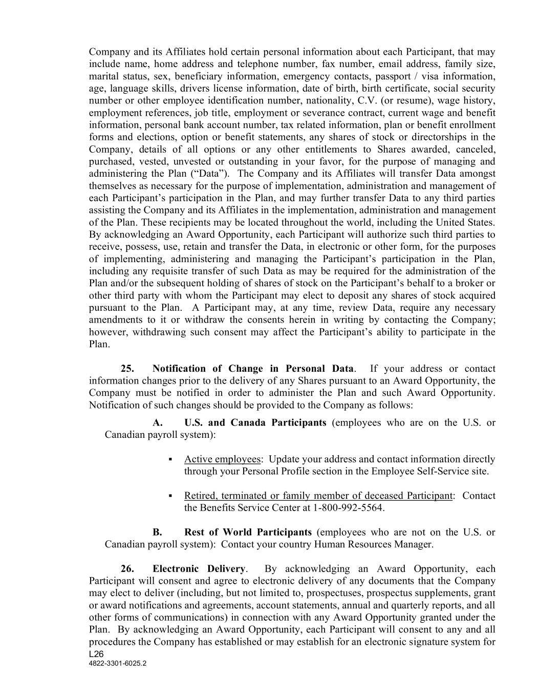 L26 4822-3301-6025.2 Company and its Affiliates hold certain personal information about each Participant, that may include name, home address and telephone number, fax number, email address, family size, marital status, sex, beneficiary information, emergency contacts, passport / visa information, age, language skills, drivers license information, date of birth, birth certificate, social security number or other employee identification number, nationality, C.V. (or resume), wage history, employment references, job title, employment or severance contract, current wage and benefit information, personal bank account number, tax related information, plan or benefit enrollment forms and elections, option or benefit statements, any shares of stock or directorships in the Company, details of all options or any other entitlements to Shares awarded, canceled, purchased, vested, unvested or outstanding in your favor, for the purpose of managing and administering the Plan (“Data”). The Company and its Affiliates will transfer Data amongst themselves as necessary for the purpose of implementation, administration and management of each Participant’s participation in the Plan, and may further transfer Data to any third parties assisting the Company and its Affiliates in the implementation, administration and management of the Plan. These recipients may be located throughout the world, including the United States. By acknowledging an Award Opportunity, each Participant will authorize such third parties to receive, possess, use, retain and transfer the Data, in electronic or other form, for the purposes of implementing, administering and managing the Participant’s participation in the Plan, including any requisite transfer of such Data as may be required for the administration of the Plan and/or the subsequent holding of shares of stock on the Participant’s behalf to a broker or other third party with whom the Participant may elect to deposit any shares of stock acquired pursuant to the Plan. A Participant may, at any time, review Data, require any necessary amendments to it or withdraw the consents herein in writing by contacting the Company; however, withdrawing such consent may affect the Participant’s ability to participate in the Plan. 25. Notification of Change in Personal Data. If your address or contact information changes prior to the delivery of any Shares pursuant to an Award Opportunity, the Company must be notified in order to administer the Plan and such Award Opportunity. Notification of such changes should be provided to the Company as follows: A. U.S. and Canada Participants (employees who are on the U.S. or Canadian payroll system):  Active employees: Update your address and contact information directly through your Personal Profile section in the Employee Self-Service site.  Retired, terminated or family member of deceased Participant: Contact the Benefits Service Center at 1-800-992-5564. B. Rest of World Participants (employees who are not on the U.S. or Canadian payroll system): Contact your country Human Resources Manager. 26. Electronic Delivery. By acknowledging an Award Opportunity, each Participant will consent and agree to electronic delivery of any documents that the Company may elect to deliver (including, but not limited to, prospectuses, prospectus supplements, grant or award notifications and agreements, account statements, annual and quarterly reports, and all other forms of communications) in connection with any Award Opportunity granted under the Plan. By acknowledging an Award Opportunity, each Participant will consent to any and all procedures the Company has established or may establish for an electronic signature system for