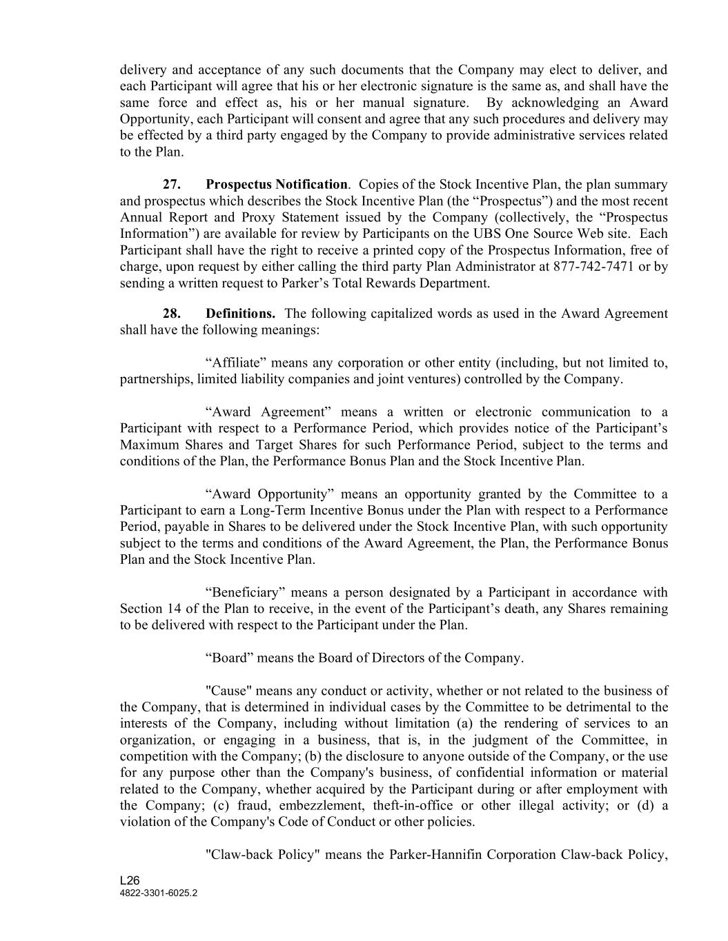 L26 4822-3301-6025.2 delivery and acceptance of any such documents that the Company may elect to deliver, and each Participant will agree that his or her electronic signature is the same as, and shall have the same force and effect as, his or her manual signature. By acknowledging an Award Opportunity, each Participant will consent and agree that any such procedures and delivery may be effected by a third party engaged by the Company to provide administrative services related to the Plan. 27. Prospectus Notification. Copies of the Stock Incentive Plan, the plan summary and prospectus which describes the Stock Incentive Plan (the “Prospectus”) and the most recent Annual Report and Proxy Statement issued by the Company (collectively, the “Prospectus Information”) are available for review by Participants on the UBS One Source Web site. Each Participant shall have the right to receive a printed copy of the Prospectus Information, free of charge, upon request by either calling the third party Plan Administrator at 877-742-7471 or by sending a written request to Parker’s Total Rewards Department. 28. Definitions. The following capitalized words as used in the Award Agreement shall have the following meanings: “Affiliate” means any corporation or other entity (including, but not limited to, partnerships, limited liability companies and joint ventures) controlled by the Company. “Award Agreement” means a written or electronic communication to a Participant with respect to a Performance Period, which provides notice of the Participant’s Maximum Shares and Target Shares for such Performance Period, subject to the terms and conditions of the Plan, the Performance Bonus Plan and the Stock Incentive Plan. “Award Opportunity” means an opportunity granted by the Committee to a Participant to earn a Long-Term Incentive Bonus under the Plan with respect to a Performance Period, payable in Shares to be delivered under the Stock Incentive Plan, with such opportunity subject to the terms and conditions of the Award Agreement, the Plan, the Performance Bonus Plan and the Stock Incentive Plan. “Beneficiary” means a person designated by a Participant in accordance with Section 14 of the Plan to receive, in the event of the Participant’s death, any Shares remaining to be delivered with respect to the Participant under the Plan. “Board” means the Board of Directors of the Company. "Cause" means any conduct or activity, whether or not related to the business of the Company, that is determined in individual cases by the Committee to be detrimental to the interests of the Company, including without limitation (a) the rendering of services to an organization, or engaging in a business, that is, in the judgment of the Committee, in competition with the Company; (b) the disclosure to anyone outside of the Company, or the use for any purpose other than the Company's business, of confidential information or material related to the Company, whether acquired by the Participant during or after employment with the Company; (c) fraud, embezzlement, theft-in-office or other illegal activity; or (d) a violation of the Company's Code of Conduct or other policies. "Claw-back Policy" means the Parker-Hannifin Corporation Claw-back Policy,