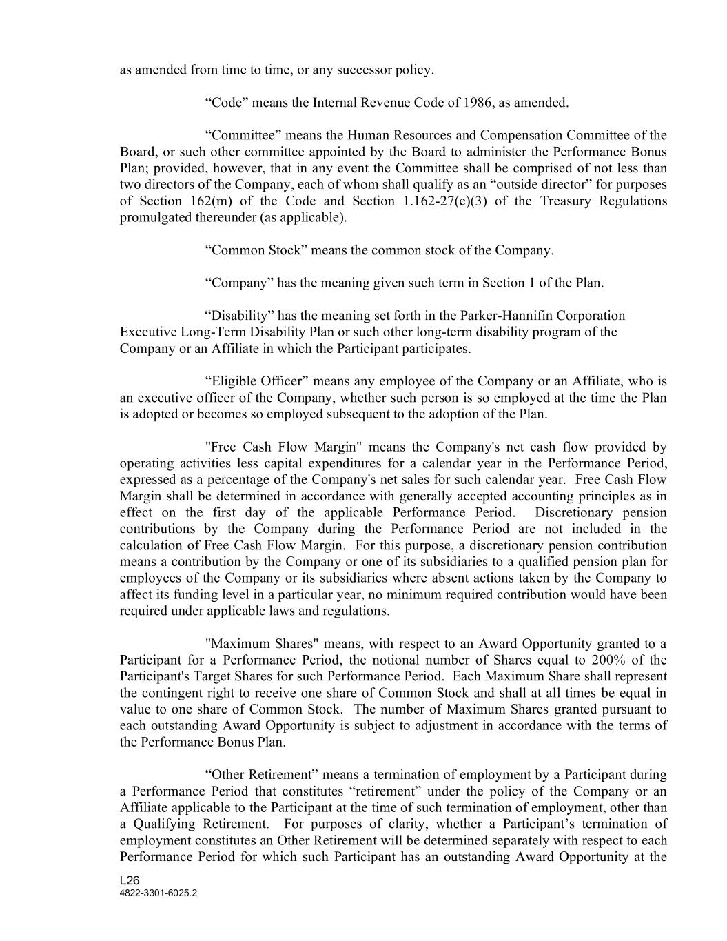 L26 4822-3301-6025.2 as amended from time to time, or any successor policy. “Code” means the Internal Revenue Code of 1986, as amended. “Committee” means the Human Resources and Compensation Committee of the Board, or such other committee appointed by the Board to administer the Performance Bonus Plan; provided, however, that in any event the Committee shall be comprised of not less than two directors of the Company, each of whom shall qualify as an “outside director” for purposes of Section 162(m) of the Code and Section 1.162-27(e)(3) of the Treasury Regulations promulgated thereunder (as applicable). “Common Stock” means the common stock of the Company. “Company” has the meaning given such term in Section 1 of the Plan. “Disability” has the meaning set forth in the Parker-Hannifin Corporation Executive Long-Term Disability Plan or such other long-term disability program of the Company or an Affiliate in which the Participant participates. “Eligible Officer” means any employee of the Company or an Affiliate, who is an executive officer of the Company, whether such person is so employed at the time the Plan is adopted or becomes so employed subsequent to the adoption of the Plan. "Free Cash Flow Margin" means the Company's net cash flow provided by operating activities less capital expenditures for a calendar year in the Performance Period, expressed as a percentage of the Company's net sales for such calendar year. Free Cash Flow Margin shall be determined in accordance with generally accepted accounting principles as in effect on the first day of the applicable Performance Period. Discretionary pension contributions by the Company during the Performance Period are not included in the calculation of Free Cash Flow Margin. For this purpose, a discretionary pension contribution means a contribution by the Company or one of its subsidiaries to a qualified pension plan for employees of the Company or its subsidiaries where absent actions taken by the Company to affect its funding level in a particular year, no minimum required contribution would have been required under applicable laws and regulations. "Maximum Shares" means, with respect to an Award Opportunity granted to a Participant for a Performance Period, the notional number of Shares equal to 200% of the Participant's Target Shares for such Performance Period. Each Maximum Share shall represent the contingent right to receive one share of Common Stock and shall at all times be equal in value to one share of Common Stock. The number of Maximum Shares granted pursuant to each outstanding Award Opportunity is subject to adjustment in accordance with the terms of the Performance Bonus Plan. “Other Retirement” means a termination of employment by a Participant during a Performance Period that constitutes “retirement” under the policy of the Company or an Affiliate applicable to the Participant at the time of such termination of employment, other than a Qualifying Retirement. For purposes of clarity, whether a Participant’s termination of employment constitutes an Other Retirement will be determined separately with respect to each Performance Period for which such Participant has an outstanding Award Opportunity at the