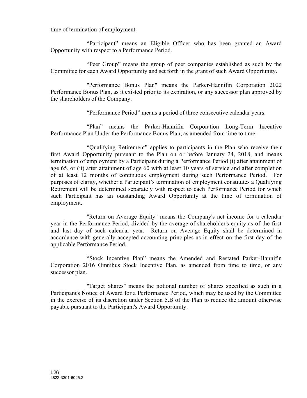 L26 4822-3301-6025.2 time of termination of employment. “Participant” means an Eligible Officer who has been granted an Award Opportunity with respect to a Performance Period. “Peer Group” means the group of peer companies established as such by the Committee for each Award Opportunity and set forth in the grant of such Award Opportunity. "Performance Bonus Plan" means the Parker-Hannifin Corporation 2022 Performance Bonus Plan, as it existed prior to its expiration, or any successor plan approved by the shareholders of the Company. “Performance Period” means a period of three consecutive calendar years. “Plan” means the Parker-Hannifin Corporation Long-Term Incentive Performance Plan Under the Performance Bonus Plan, as amended from time to time. “Qualifying Retirement” applies to participants in the Plan who receive their first Award Opportunity pursuant to the Plan on or before January 24, 2018, and means termination of employment by a Participant during a Performance Period (i) after attainment of age 65, or (ii) after attainment of age 60 with at least 10 years of service and after completion of at least 12 months of continuous employment during such Performance Period. For purposes of clarity, whether a Participant’s termination of employment constitutes a Qualifying Retirement will be determined separately with respect to each Performance Period for which such Participant has an outstanding Award Opportunity at the time of termination of employment. "Return on Average Equity" means the Company's net income for a calendar year in the Performance Period, divided by the average of shareholder's equity as of the first and last day of such calendar year. Return on Average Equity shall be determined in accordance with generally accepted accounting principles as in effect on the first day of the applicable Performance Period. “Stock Incentive Plan” means the Amended and Restated Parker-Hannifin Corporation 2016 Omnibus Stock Incentive Plan, as amended from time to time, or any successor plan. "Target Shares" means the notional number of Shares specified as such in a Participant's Notice of Award for a Performance Period, which may be used by the Committee in the exercise of its discretion under Section 5.B of the Plan to reduce the amount otherwise payable pursuant to the Participant's Award Opportunity.
