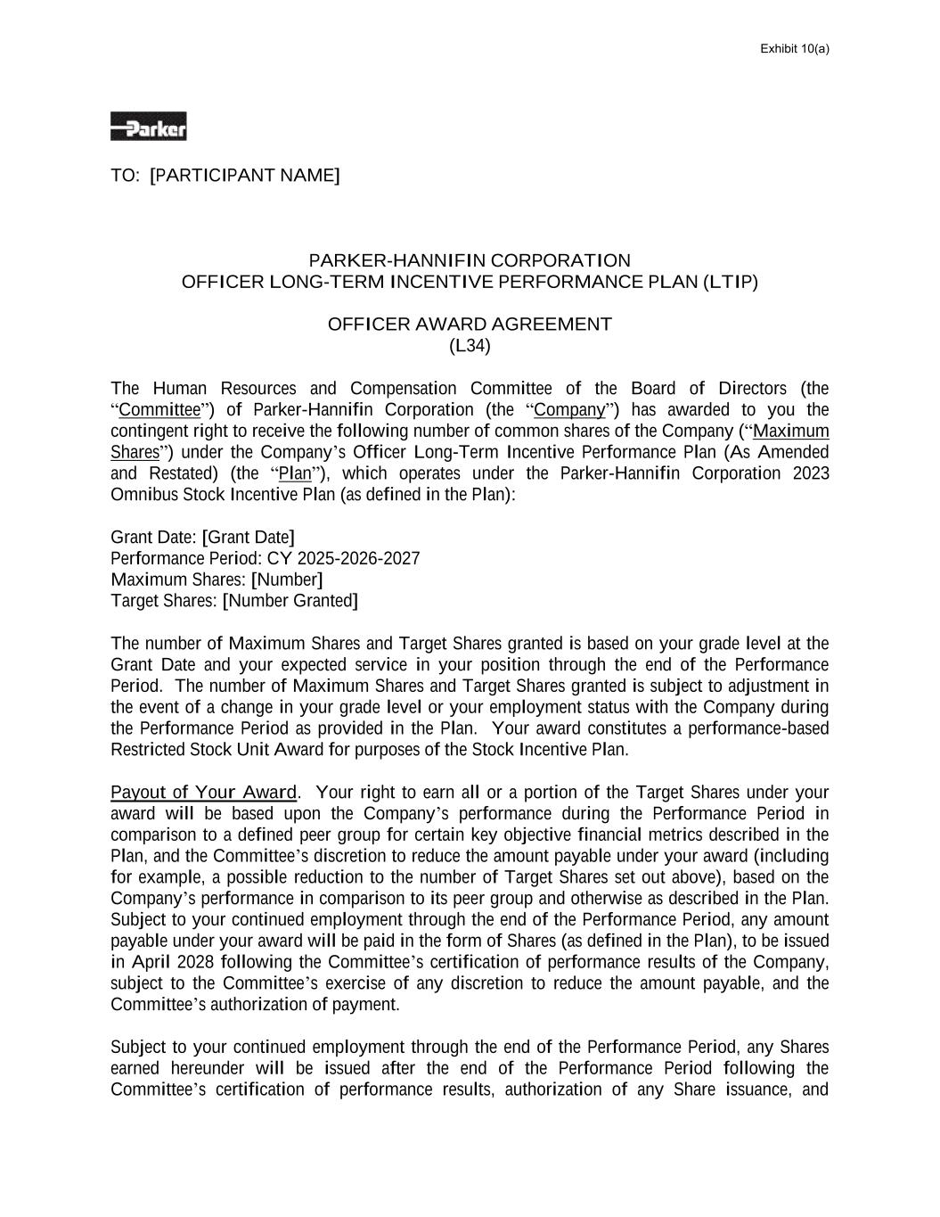 TO: [PARTICIPANT NAME] PARKER-HANNIFIN CORPORATION OFFICER LONG-TERM INCENTIVE PERFORMANCE PLAN (LTIP) OFFICER AWARD AGREEMENT (L34) The Human Resources and Compensation Committee of the Board of Directors (the “Committee”) of Parker-Hannifin Corporation (the “Company”) has awarded to you the contingent right to receive the following number of common shares of the Company (“Maximum Shares”) under the Company’s Officer Long-Term Incentive Performance Plan (As Amended and Restated) (the “Plan”), which operates under the Parker-Hannifin Corporation 2023 Omnibus Stock Incentive Plan (as defined in the Plan): Grant Date: [Grant Date] Performance Period: CY 2025-2026-2027 Maximum Shares: [Number] Target Shares: [Number Granted] The number of Maximum Shares and Target Shares granted is based on your grade level at the Grant Date and your expected service in your position through the end of the Performance Period. The number of Maximum Shares and Target Shares granted is subject to adjustment in the event of a change in your grade level or your employment status with the Company during the Performance Period as provided in the Plan. Your award constitutes a performance-based Restricted Stock Unit Award for purposes of the Stock Incentive Plan. Payout of Your Award. Your right to earn all or a portion of the Target Shares under your award will be based upon the Company’s performance during the Performance Period in comparison to a defined peer group for certain key objective financial metrics described in the Plan, and the Committee’s discretion to reduce the amount payable under your award (including for example, a possible reduction to the number of Target Shares set out above), based on the Company’s performance in comparison to its peer group and otherwise as described in the Plan. Subject to your continued employment through the end of the Performance Period, any amount payable under your award will be paid in the form of Shares (as defined in the Plan), to be issued in April 2028 following the Committee’s certification of performance results of the Company, subject to the Committee’s exercise of any discretion to reduce the amount payable, and the Committee’s authorization of payment. Subject to your continued employment through the end of the Performance Period, any Shares earned hereunder will be issued after the end of the Performance Period following the Committee’s certification of performance results, authorization of any Share issuance, and Exhibit 10(a)