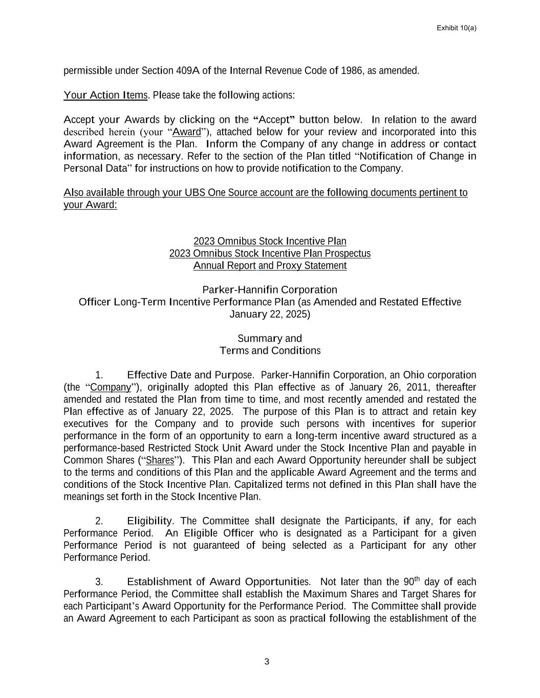 3 permissible under Section 409A of the Internal Revenue Code of 1986, as amended. Your Action Items. Please take the following actions: Accept your Awards by clicking on the “Accept” button below. In relation to the award described herein (your “Award”), attached below for your review and incorporated into this Award Agreement is the Plan. Inform the Company of any change in address or contact information, as necessary. Refer to the section of the Plan titled “Notification of Change in Personal Data” for instructions on how to provide notification to the Company. Also available through your UBS One Source account are the following documents pertinent to your Award: 2023 Omnibus Stock Incentive Plan 2023 Omnibus Stock Incentive Plan Prospectus Annual Report and Proxy Statement Parker-Hannifin Corporation Officer Long-Term Incentive Performance Plan (as Amended and Restated Effective January 22, 2025) Summary and Terms and Conditions 1. Effective Date and Purpose. Parker-Hannifin Corporation, an Ohio corporation (the “Company”), originally adopted this Plan effective as of January 26, 2011, thereafter amended and restated the Plan from time to time, and most recently amended and restated the Plan effective as of January 22, 2025. The purpose of this Plan is to attract and retain key executives for the Company and to provide such persons with incentives for superior performance in the form of an opportunity to earn a long-term incentive award structured as a performance-based Restricted Stock Unit Award under the Stock Incentive Plan and payable in Common Shares (“Shares”). This Plan and each Award Opportunity hereunder shall be subject to the terms and conditions of this Plan and the applicable Award Agreement and the terms and conditions of the Stock Incentive Plan. Capitalized terms not defined in this Plan shall have the meanings set forth in the Stock Incentive Plan. 2. Eligibility. The Committee shall designate the Participants, if any, for each Performance Period. An Eligible Officer who is designated as a Participant for a given Performance Period is not guaranteed of being selected as a Participant for any other Performance Period. 3. Establishment of Award Opportunities. Not later than the 90th day of each Performance Period, the Committee shall establish the Maximum Shares and Target Shares for each Participant’s Award Opportunity for the Performance Period. The Committee shall provide an Award Agreement to each Participant as soon as practical following the establishment of the Exhibit 10(a)