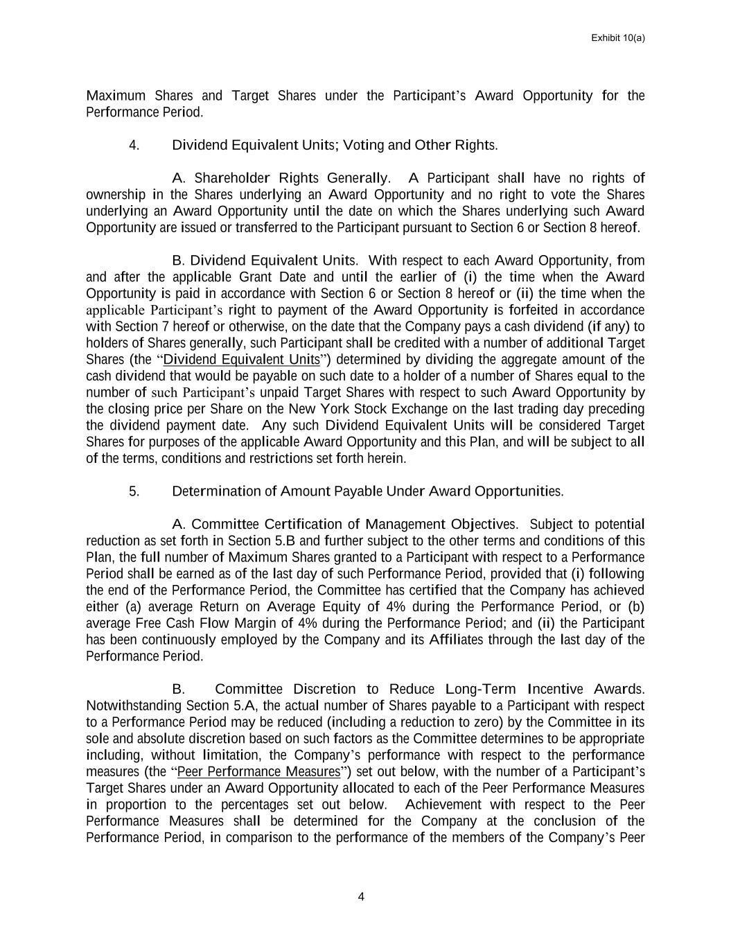 4 Maximum Shares and Target Shares under the Participant’s Award Opportunity for the Performance Period. 4. Dividend Equivalent Units; Voting and Other Rights. A. Shareholder Rights Generally. A Participant shall have no rights of ownership in the Shares underlying an Award Opportunity and no right to vote the Shares underlying an Award Opportunity until the date on which the Shares underlying such Award Opportunity are issued or transferred to the Participant pursuant to Section 6 or Section 8 hereof. B. Dividend Equivalent Units. With respect to each Award Opportunity, from and after the applicable Grant Date and until the earlier of (i) the time when the Award Opportunity is paid in accordance with Section 6 or Section 8 hereof or (ii) the time when the applicable Participant’s right to payment of the Award Opportunity is forfeited in accordance with Section 7 hereof or otherwise, on the date that the Company pays a cash dividend (if any) to holders of Shares generally, such Participant shall be credited with a number of additional Target Shares (the “Dividend Equivalent Units”) determined by dividing the aggregate amount of the cash dividend that would be payable on such date to a holder of a number of Shares equal to the number of such Participant’s unpaid Target Shares with respect to such Award Opportunity by the closing price per Share on the New York Stock Exchange on the last trading day preceding the dividend payment date. Any such Dividend Equivalent Units will be considered Target Shares for purposes of the applicable Award Opportunity and this Plan, and will be subject to all of the terms, conditions and restrictions set forth herein. 5. Determination of Amount Payable Under Award Opportunities. A. Committee Certification of Management Objectives. Subject to potential reduction as set forth in Section 5.B and further subject to the other terms and conditions of this Plan, the full number of Maximum Shares granted to a Participant with respect to a Performance Period shall be earned as of the last day of such Performance Period, provided that (i) following the end of the Performance Period, the Committee has certified that the Company has achieved either (a) average Return on Average Equity of 4% during the Performance Period, or (b) average Free Cash Flow Margin of 4% during the Performance Period; and (ii) the Participant has been continuously employed by the Company and its Affiliates through the last day of the Performance Period. B. Committee Discretion to Reduce Long-Term Incentive Awards. Notwithstanding Section 5.A, the actual number of Shares payable to a Participant with respect to a Performance Period may be reduced (including a reduction to zero) by the Committee in its sole and absolute discretion based on such factors as the Committee determines to be appropriate including, without limitation, the Company’s performance with respect to the performance measures (the “Peer Performance Measures”) set out below, with the number of a Participant’s Target Shares under an Award Opportunity allocated to each of the Peer Performance Measures in proportion to the percentages set out below. Achievement with respect to the Peer Performance Measures shall be determined for the Company at the conclusion of the Performance Period, in comparison to the performance of the members of the Company’s Peer Exhibit 10(a)