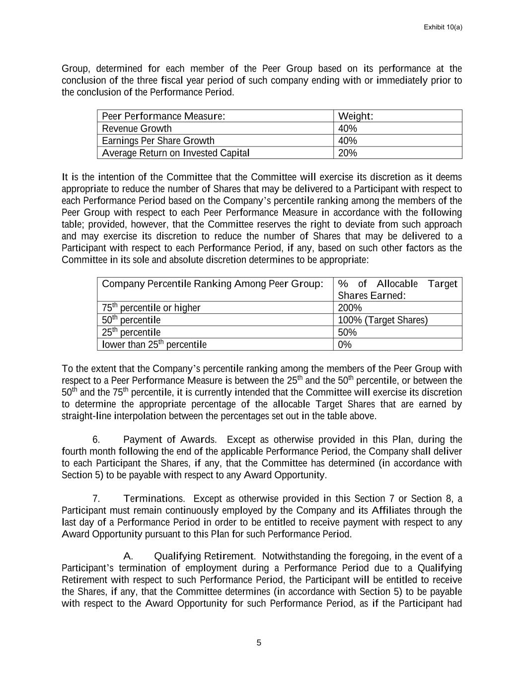 5 Group, determined for each member of the Peer Group based on its performance at the conclusion of the three fiscal year period of such company ending with or immediately prior to the conclusion of the Performance Period. Peer Performance Measure: Weight: Revenue Growth 40% Earnings Per Share Growth 40% Average Return on Invested Capital 20% It is the intention of the Committee that the Committee will exercise its discretion as it deems appropriate to reduce the number of Shares that may be delivered to a Participant with respect to each Performance Period based on the Company’s percentile ranking among the members of the Peer Group with respect to each Peer Performance Measure in accordance with the following table; provided, however, that the Committee reserves the right to deviate from such approach and may exercise its discretion to reduce the number of Shares that may be delivered to a Participant with respect to each Performance Period, if any, based on such other factors as the Committee in its sole and absolute discretion determines to be appropriate: Company Percentile Ranking Among Peer Group: % of Allocable Target Shares Earned: 75th percentile or higher 200% 50th percentile 100% (Target Shares) 25th percentile 50% lower than 25th percentile 0% To the extent that the Company’s percentile ranking among the members of the Peer Group with respect to a Peer Performance Measure is between the 25th and the 50th percentile, or between the 50th and the 75th percentile, it is currently intended that the Committee will exercise its discretion to determine the appropriate percentage of the allocable Target Shares that are earned by straight-line interpolation between the percentages set out in the table above. 6. Payment of Awards. Except as otherwise provided in this Plan, during the fourth month following the end of the applicable Performance Period, the Company shall deliver to each Participant the Shares, if any, that the Committee has determined (in accordance with Section 5) to be payable with respect to any Award Opportunity. 7. Terminations. Except as otherwise provided in this Section 7 or Section 8, a Participant must remain continuously employed by the Company and its Affiliates through the last day of a Performance Period in order to be entitled to receive payment with respect to any Award Opportunity pursuant to this Plan for such Performance Period. A. Qualifying Retirement. Notwithstanding the foregoing, in the event of a Participant’s termination of employment during a Performance Period due to a Qualifying Retirement with respect to such Performance Period, the Participant will be entitled to receive the Shares, if any, that the Committee determines (in accordance with Section 5) to be payable with respect to the Award Opportunity for such Performance Period, as if the Participant had Exhibit 10(a)