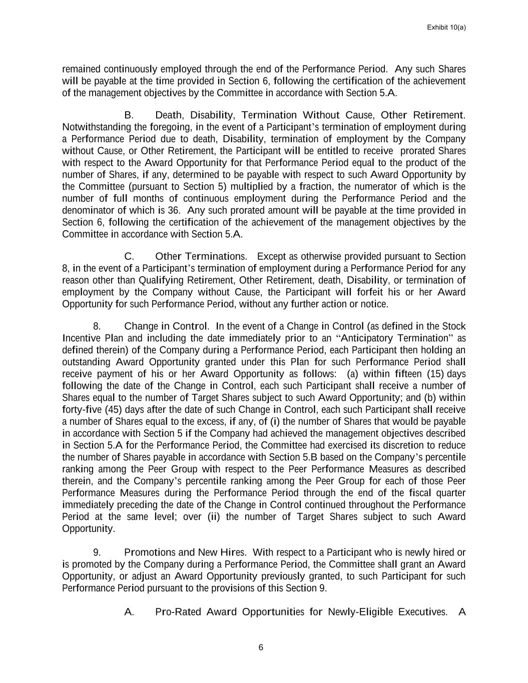 6 remained continuously employed through the end of the Performance Period. Any such Shares will be payable at the time provided in Section 6, following the certification of the achievement of the management objectives by the Committee in accordance with Section 5.A. B. Death, Disability, Termination Without Cause, Other Retirement. Notwithstanding the foregoing, in the event of a Participant’s termination of employment during a Performance Period due to death, Disability, termination of employment by the Company without Cause, or Other Retirement, the Participant will be entitled to receive prorated Shares with respect to the Award Opportunity for that Performance Period equal to the product of the number of Shares, if any, determined to be payable with respect to such Award Opportunity by the Committee (pursuant to Section 5) multiplied by a fraction, the numerator of which is the number of full months of continuous employment during the Performance Period and the denominator of which is 36. Any such prorated amount will be payable at the time provided in Section 6, following the certification of the achievement of the management objectives by the Committee in accordance with Section 5.A. C. Other Terminations. Except as otherwise provided pursuant to Section 8, in the event of a Participant’s termination of employment during a Performance Period for any reason other than Qualifying Retirement, Other Retirement, death, Disability, or termination of employment by the Company without Cause, the Participant will forfeit his or her Award Opportunity for such Performance Period, without any further action or notice. 8. Change in Control. In the event of a Change in Control (as defined in the Stock Incentive Plan and including the date immediately prior to an “Anticipatory Termination” as defined therein) of the Company during a Performance Period, each Participant then holding an outstanding Award Opportunity granted under this Plan for such Performance Period shall receive payment of his or her Award Opportunity as follows: (a) within fifteen (15) days following the date of the Change in Control, each such Participant shall receive a number of Shares equal to the number of Target Shares subject to such Award Opportunity; and (b) within forty-five (45) days after the date of such Change in Control, each such Participant shall receive a number of Shares equal to the excess, if any, of (i) the number of Shares that would be payable in accordance with Section 5 if the Company had achieved the management objectives described in Section 5.A for the Performance Period, the Committee had exercised its discretion to reduce the number of Shares payable in accordance with Section 5.B based on the Company’s percentile ranking among the Peer Group with respect to the Peer Performance Measures as described therein, and the Company’s percentile ranking among the Peer Group for each of those Peer Performance Measures during the Performance Period through the end of the fiscal quarter immediately preceding the date of the Change in Control continued throughout the Performance Period at the same level; over (ii) the number of Target Shares subject to such Award Opportunity. 9. Promotions and New Hires. With respect to a Participant who is newly hired or is promoted by the Company during a Performance Period, the Committee shall grant an Award Opportunity, or adjust an Award Opportunity previously granted, to such Participant for such Performance Period pursuant to the provisions of this Section 9. A. Pro-Rated Award Opportunities for Newly-Eligible Executives. A Exhibit 10(a)
