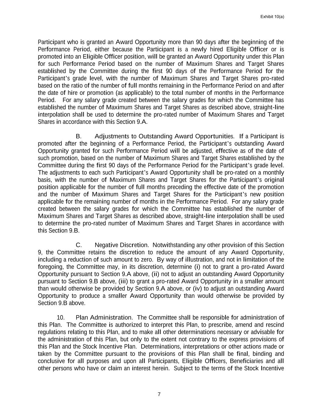 7 Participant who is granted an Award Opportunity more than 90 days after the beginning of the Performance Period, either because the Participant is a newly hired Eligible Officer or is promoted into an Eligible Officer position, will be granted an Award Opportunity under this Plan for such Performance Period based on the number of Maximum Shares and Target Shares established by the Committee during the first 90 days of the Performance Period for the Participant’s grade level, with the number of Maximum Shares and Target Shares pro-rated based on the ratio of the number of full months remaining in the Performance Period on and after the date of hire or promotion (as applicable) to the total number of months in the Performance Period. For any salary grade created between the salary grades for which the Committee has established the number of Maximum Shares and Target Shares as described above, straight-line interpolation shall be used to determine the pro-rated number of Maximum Shares and Target Shares in accordance with this Section 9.A. B. Adjustments to Outstanding Award Opportunities. If a Participant is promoted after the beginning of a Performance Period, the Participant’s outstanding Award Opportunity granted for such Performance Period will be adjusted, effective as of the date of such promotion, based on the number of Maximum Shares and Target Shares established by the Committee during the first 90 days of the Performance Period for the Participant’s grade level. The adjustments to each such Participant’s Award Opportunity shall be pro-rated on a monthly basis, with the number of Maximum Shares and Target Shares for the Participant’s original position applicable for the number of full months preceding the effective date of the promotion and the number of Maximum Shares and Target Shares for the Participant’s new position applicable for the remaining number of months in the Performance Period. For any salary grade created between the salary grades for which the Committee has established the number of Maximum Shares and Target Shares as described above, straight-line interpolation shall be used to determine the pro-rated number of Maximum Shares and Target Shares in accordance with this Section 9.B. C. Negative Discretion. Notwithstanding any other provision of this Section 9, the Committee retains the discretion to reduce the amount of any Award Opportunity, including a reduction of such amount to zero. By way of illustration, and not in limitation of the foregoing, the Committee may, in its discretion, determine (i) not to grant a pro-rated Award Opportunity pursuant to Section 9.A above, (ii) not to adjust an outstanding Award Opportunity pursuant to Section 9.B above, (iii) to grant a pro-rated Award Opportunity in a smaller amount than would otherwise be provided by Section 9.A above, or (iv) to adjust an outstanding Award Opportunity to produce a smaller Award Opportunity than would otherwise be provided by Section 9.B above. 10. Plan Administration. The Committee shall be responsible for administration of this Plan. The Committee is authorized to interpret this Plan, to prescribe, amend and rescind regulations relating to this Plan, and to make all other determinations necessary or advisable for the administration of this Plan, but only to the extent not contrary to the express provisions of this Plan and the Stock Incentive Plan. Determinations, interpretations or other actions made or taken by the Committee pursuant to the provisions of this Plan shall be final, binding and conclusive for all purposes and upon all Participants, Eligible Officers, Beneficiaries and all other persons who have or claim an interest herein. Subject to the terms of the Stock Incentive Exhibit 10(a)