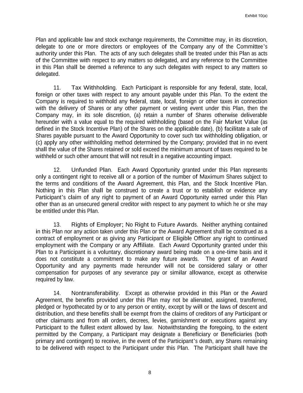 8 Plan and applicable law and stock exchange requirements, the Committee may, in its discretion, delegate to one or more directors or employees of the Company any of the Committee’s authority under this Plan. The acts of any such delegates shall be treated under this Plan as acts of the Committee with respect to any matters so delegated, and any reference to the Committee in this Plan shall be deemed a reference to any such delegates with respect to any matters so delegated. 11. Tax Withholding. Each Participant is responsible for any federal, state, local, foreign or other taxes with respect to any amount payable under this Plan. To the extent the Company is required to withhold any federal, state, local, foreign or other taxes in connection with the delivery of Shares or any other payment or vesting event under this Plan, then the Company may, in its sole discretion, (a) retain a number of Shares otherwise deliverable hereunder with a value equal to the required withholding (based on the Fair Market Value (as defined in the Stock Incentive Plan) of the Shares on the applicable date), (b) facilitate a sale of Shares payable pursuant to the Award Opportunity to cover such tax withholding obligation, or (c) apply any other withholding method determined by the Company; provided that in no event shall the value of the Shares retained or sold exceed the minimum amount of taxes required to be withheld or such other amount that will not result in a negative accounting impact. 12. Unfunded Plan. Each Award Opportunity granted under this Plan represents only a contingent right to receive all or a portion of the number of Maximum Shares subject to the terms and conditions of the Award Agreement, this Plan, and the Stock Incentive Plan. Nothing in this Plan shall be construed to create a trust or to establish or evidence any Participant’s claim of any right to payment of an Award Opportunity earned under this Plan other than as an unsecured general creditor with respect to any payment to which he or she may be entitled under this Plan. 13. Rights of Employer; No Right to Future Awards. Neither anything contained in this Plan nor any action taken under this Plan or the Award Agreement shall be construed as a contract of employment or as giving any Participant or Eligible Officer any right to continued employment with the Company or any Affiliate. Each Award Opportunity granted under this Plan to a Participant is a voluntary, discretionary award being made on a one-time basis and it does not constitute a commitment to make any future awards. The grant of an Award Opportunity and any payments made hereunder will not be considered salary or other compensation for purposes of any severance pay or similar allowance, except as otherwise required by law. 14. Nontransferability. Except as otherwise provided in this Plan or the Award Agreement, the benefits provided under this Plan may not be alienated, assigned, transferred, pledged or hypothecated by or to any person or entity, except by will or the laws of descent and distribution, and these benefits shall be exempt from the claims of creditors of any Participant or other claimants and from all orders, decrees, levies, garnishment or executions against any Participant to the fullest extent allowed by law. Notwithstanding the foregoing, to the extent permitted by the Company, a Participant may designate a Beneficiary or Beneficiaries (both primary and contingent) to receive, in the event of the Participant’s death, any Shares remaining to be delivered with respect to the Participant under this Plan. The Participant shall have the Exhibit 10(a)