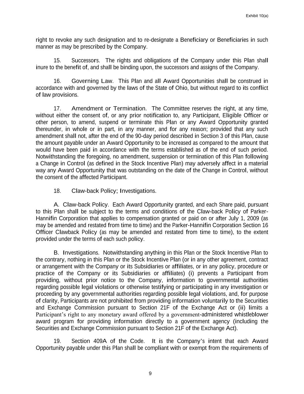 9 right to revoke any such designation and to re-designate a Beneficiary or Beneficiaries in such manner as may be prescribed by the Company. 15. Successors. The rights and obligations of the Company under this Plan shall inure to the benefit of, and shall be binding upon, the successors and assigns of the Company. 16. Governing Law. This Plan and all Award Opportunities shall be construed in accordance with and governed by the laws of the State of Ohio, but without regard to its conflict of law provisions. 17. Amendment or Termination. The Committee reserves the right, at any time, without either the consent of, or any prior notification to, any Participant, Eligible Officer or other person, to amend, suspend or terminate this Plan or any Award Opportunity granted thereunder, in whole or in part, in any manner, and for any reason; provided that any such amendment shall not, after the end of the 90-day period described in Section 3 of this Plan, cause the amount payable under an Award Opportunity to be increased as compared to the amount that would have been paid in accordance with the terms established as of the end of such period. Notwithstanding the foregoing, no amendment, suspension or termination of this Plan following a Change in Control (as defined in the Stock Incentive Plan) may adversely affect in a material way any Award Opportunity that was outstanding on the date of the Change in Control, without the consent of the affected Participant. 18. Claw-back Policy; Investigations. A. Claw-back Policy. Each Award Opportunity granted, and each Share paid, pursuant to this Plan shall be subject to the terms and conditions of the Claw-back Policy of Parker- Hannifin Corporation that applies to compensation granted or paid on or after July 1, 2009 (as may be amended and restated from time to time) and the Parker-Hannifin Corporation Section 16 Officer Clawback Policy (as may be amended and restated from time to time), to the extent provided under the terms of each such policy. B. Investigations. Notwithstanding anything in this Plan or the Stock Incentive Plan to the contrary, nothing in this Plan or the Stock Incentive Plan (or in any other agreement, contract or arrangement with the Company or its Subsidiaries or affiliates, or in any policy, procedure or practice of the Company or its Subsidiaries or affiliates) (i) prevents a Participant from providing, without prior notice to the Company, information to governmental authorities regarding possible legal violations or otherwise testifying or participating in any investigation or proceeding by any governmental authorities regarding possible legal violations, and, for purpose of clarity, Participants are not prohibited from providing information voluntarily to the Securities and Exchange Commission pursuant to Section 21F of the Exchange Act or (ii) limits a Participant’s right to any monetary award offered by a government-administered whistleblower award program for providing information directly to a government agency (including the Securities and Exchange Commission pursuant to Section 21F of the Exchange Act). 19. Section 409A of the Code. It is the Company’s intent that each Award Opportunity payable under this Plan shall be compliant with or exempt from the requirements of Exhibit 10(a)