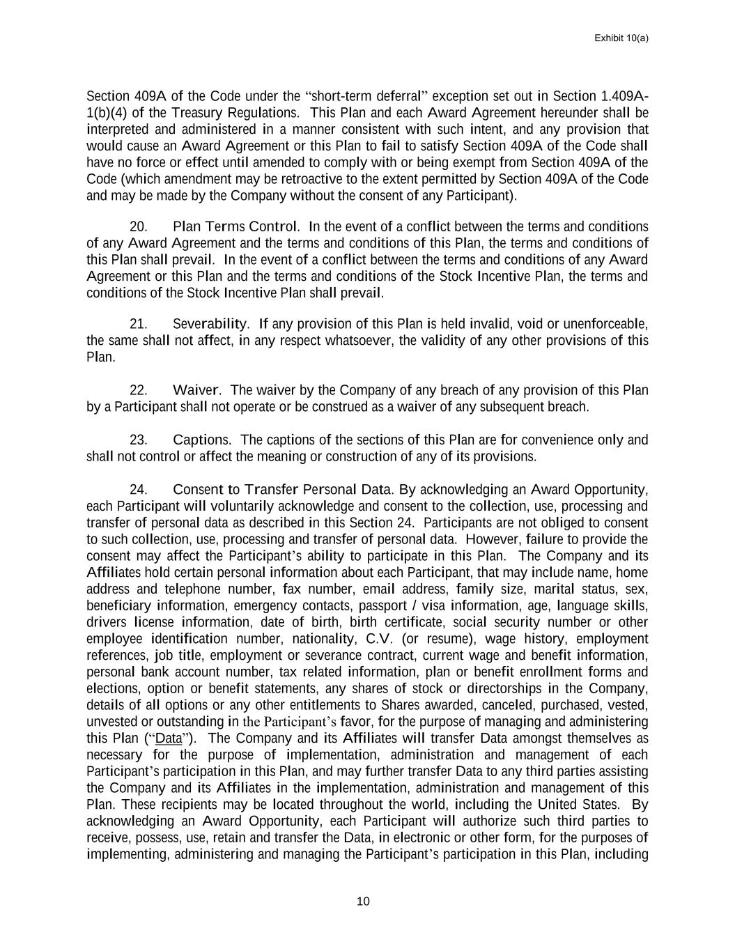 10 Section 409A of the Code under the “short-term deferral” exception set out in Section 1.409A- 1(b)(4) of the Treasury Regulations. This Plan and each Award Agreement hereunder shall be interpreted and administered in a manner consistent with such intent, and any provision that would cause an Award Agreement or this Plan to fail to satisfy Section 409A of the Code shall have no force or effect until amended to comply with or being exempt from Section 409A of the Code (which amendment may be retroactive to the extent permitted by Section 409A of the Code and may be made by the Company without the consent of any Participant). 20. Plan Terms Control. In the event of a conflict between the terms and conditions of any Award Agreement and the terms and conditions of this Plan, the terms and conditions of this Plan shall prevail. In the event of a conflict between the terms and conditions of any Award Agreement or this Plan and the terms and conditions of the Stock Incentive Plan, the terms and conditions of the Stock Incentive Plan shall prevail. 21. Severability. If any provision of this Plan is held invalid, void or unenforceable, the same shall not affect, in any respect whatsoever, the validity of any other provisions of this Plan. 22. Waiver. The waiver by the Company of any breach of any provision of this Plan by a Participant shall not operate or be construed as a waiver of any subsequent breach. 23. Captions. The captions of the sections of this Plan are for convenience only and shall not control or affect the meaning or construction of any of its provisions. 24. Consent to Transfer Personal Data. By acknowledging an Award Opportunity, each Participant will voluntarily acknowledge and consent to the collection, use, processing and transfer of personal data as described in this Section 24. Participants are not obliged to consent to such collection, use, processing and transfer of personal data. However, failure to provide the consent may affect the Participant’s ability to participate in this Plan. The Company and its Affiliates hold certain personal information about each Participant, that may include name, home address and telephone number, fax number, email address, family size, marital status, sex, beneficiary information, emergency contacts, passport / visa information, age, language skills, drivers license information, date of birth, birth certificate, social security number or other employee identification number, nationality, C.V. (or resume), wage history, employment references, job title, employment or severance contract, current wage and benefit information, personal bank account number, tax related information, plan or benefit enrollment forms and elections, option or benefit statements, any shares of stock or directorships in the Company, details of all options or any other entitlements to Shares awarded, canceled, purchased, vested, unvested or outstanding in the Participant’s favor, for the purpose of managing and administering this Plan (“Data”). The Company and its Affiliates will transfer Data amongst themselves as necessary for the purpose of implementation, administration and management of each Participant’s participation in this Plan, and may further transfer Data to any third parties assisting the Company and its Affiliates in the implementation, administration and management of this Plan. These recipients may be located throughout the world, including the United States. By acknowledging an Award Opportunity, each Participant will authorize such third parties to receive, possess, use, retain and transfer the Data, in electronic or other form, for the purposes of implementing, administering and managing the Participant’s participation in this Plan, including Exhibit 10(a)