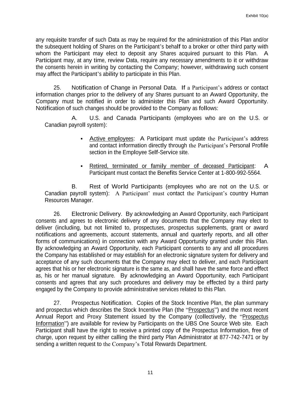 11 any requisite transfer of such Data as may be required for the administration of this Plan and/or the subsequent holding of Shares on the Participant’s behalf to a broker or other third party with whom the Participant may elect to deposit any Shares acquired pursuant to this Plan. A Participant may, at any time, review Data, require any necessary amendments to it or withdraw the consents herein in writing by contacting the Company; however, withdrawing such consent may affect the Participant’s ability to participate in this Plan. 25. Notification of Change in Personal Data. If a Participant’s address or contact information changes prior to the delivery of any Shares pursuant to an Award Opportunity, the Company must be notified in order to administer this Plan and such Award Opportunity. Notification of such changes should be provided to the Company as follows: A. U.S. and Canada Participants (employees who are on the U.S. or Canadian payroll system): ▪ Active employees: A Participant must update the Participant’s address and contact information directly through the Participant’s Personal Profile section in the Employee Self-Service site. ▪ Retired, terminated or family member of deceased Participant: A Participant must contact the Benefits Service Center at 1-800-992-5564. B. Rest of World Participants (employees who are not on the U.S. or Canadian payroll system): A Participant’ must contact the Participant’s country Human Resources Manager. 26. Electronic Delivery. By acknowledging an Award Opportunity, each Participant consents and agrees to electronic delivery of any documents that the Company may elect to deliver (including, but not limited to, prospectuses, prospectus supplements, grant or award notifications and agreements, account statements, annual and quarterly reports, and all other forms of communications) in connection with any Award Opportunity granted under this Plan. By acknowledging an Award Opportunity, each Participant consents to any and all procedures the Company has established or may establish for an electronic signature system for delivery and acceptance of any such documents that the Company may elect to deliver, and each Participant agrees that his or her electronic signature is the same as, and shall have the same force and effect as, his or her manual signature. By acknowledging an Award Opportunity, each Participant consents and agrees that any such procedures and delivery may be effected by a third party engaged by the Company to provide administrative services related to this Plan. 27. Prospectus Notification. Copies of the Stock Incentive Plan, the plan summary and prospectus which describes the Stock Incentive Plan (the “Prospectus”) and the most recent Annual Report and Proxy Statement issued by the Company (collectively, the “Prospectus Information”) are available for review by Participants on the UBS One Source Web site. Each Participant shall have the right to receive a printed copy of the Prospectus Information, free of charge, upon request by either calling the third party Plan Administrator at 877-742-7471 or by sending a written request to the Company’s Total Rewards Department. Exhibit 10(a)