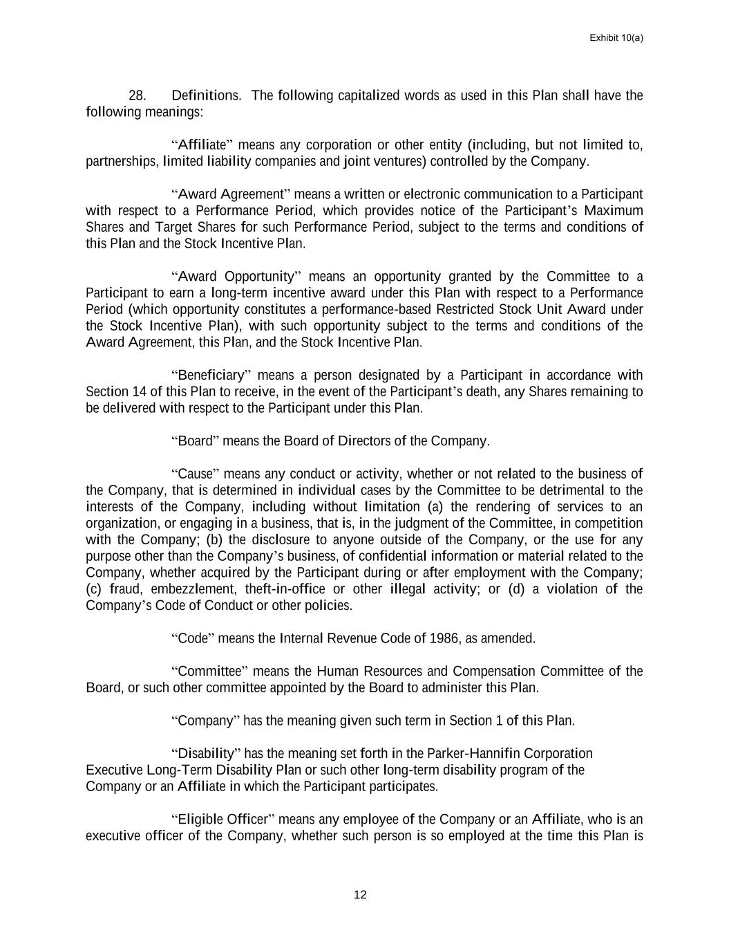 12 28. Definitions. The following capitalized words as used in this Plan shall have the following meanings: “Affiliate” means any corporation or other entity (including, but not limited to, partnerships, limited liability companies and joint ventures) controlled by the Company. “Award Agreement” means a written or electronic communication to a Participant with respect to a Performance Period, which provides notice of the Participant’s Maximum Shares and Target Shares for such Performance Period, subject to the terms and conditions of this Plan and the Stock Incentive Plan. “Award Opportunity” means an opportunity granted by the Committee to a Participant to earn a long-term incentive award under this Plan with respect to a Performance Period (which opportunity constitutes a performance-based Restricted Stock Unit Award under the Stock Incentive Plan), with such opportunity subject to the terms and conditions of the Award Agreement, this Plan, and the Stock Incentive Plan. “Beneficiary” means a person designated by a Participant in accordance with Section 14 of this Plan to receive, in the event of the Participant’s death, any Shares remaining to be delivered with respect to the Participant under this Plan. “Board” means the Board of Directors of the Company. “Cause” means any conduct or activity, whether or not related to the business of the Company, that is determined in individual cases by the Committee to be detrimental to the interests of the Company, including without limitation (a) the rendering of services to an organization, or engaging in a business, that is, in the judgment of the Committee, in competition with the Company; (b) the disclosure to anyone outside of the Company, or the use for any purpose other than the Company’s business, of confidential information or material related to the Company, whether acquired by the Participant during or after employment with the Company; (c) fraud, embezzlement, theft-in-office or other illegal activity; or (d) a violation of the Company’s Code of Conduct or other policies. “Code” means the Internal Revenue Code of 1986, as amended. “Committee” means the Human Resources and Compensation Committee of the Board, or such other committee appointed by the Board to administer this Plan. “Company” has the meaning given such term in Section 1 of this Plan. “Disability” has the meaning set forth in the Parker-Hannifin Corporation Executive Long-Term Disability Plan or such other long-term disability program of the Company or an Affiliate in which the Participant participates. “Eligible Officer” means any employee of the Company or an Affiliate, who is an executive officer of the Company, whether such person is so employed at the time this Plan is Exhibit 10(a)