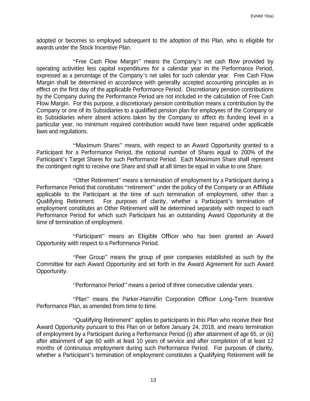 13 adopted or becomes so employed subsequent to the adoption of this Plan, who is eligible for awards under the Stock Incentive Plan. “Free Cash Flow Margin” means the Company’s net cash flow provided by operating activities less capital expenditures for a calendar year in the Performance Period, expressed as a percentage of the Company’s net sales for such calendar year. Free Cash Flow Margin shall be determined in accordance with generally accepted accounting principles as in effect on the first day of the applicable Performance Period. Discretionary pension contributions by the Company during the Performance Period are not included in the calculation of Free Cash Flow Margin. For this purpose, a discretionary pension contribution means a contribution by the Company or one of its Subsidiaries to a qualified pension plan for employees of the Company or its Subsidiaries where absent actions taken by the Company to affect its funding level in a particular year, no minimum required contribution would have been required under applicable laws and regulations. “Maximum Shares” means, with respect to an Award Opportunity granted to a Participant for a Performance Period, the notional number of Shares equal to 200% of the Participant’s Target Shares for such Performance Period. Each Maximum Share shall represent the contingent right to receive one Share and shall at all times be equal in value to one Share. “Other Retirement” means a termination of employment by a Participant during a Performance Period that constitutes “retirement” under the policy of the Company or an Affiliate applicable to the Participant at the time of such termination of employment, other than a Qualifying Retirement. For purposes of clarity, whether a Participant’s termination of employment constitutes an Other Retirement will be determined separately with respect to each Performance Period for which such Participant has an outstanding Award Opportunity at the time of termination of employment. “Participant” means an Eligible Officer who has been granted an Award Opportunity with respect to a Performance Period. “Peer Group” means the group of peer companies established as such by the Committee for each Award Opportunity and set forth in the Award Agreement for such Award Opportunity. “Performance Period” means a period of three consecutive calendar years. “Plan” means the Parker-Hannifin Corporation Officer Long-Term Incentive Performance Plan, as amended from time to time. “Qualifying Retirement” applies to participants in this Plan who receive their first Award Opportunity pursuant to this Plan on or before January 24, 2018, and means termination of employment by a Participant during a Performance Period (i) after attainment of age 65, or (ii) after attainment of age 60 with at least 10 years of service and after completion of at least 12 months of continuous employment during such Performance Period. For purposes of clarity, whether a Participant’s termination of employment constitutes a Qualifying Retirement will be Exhibit 10(a)