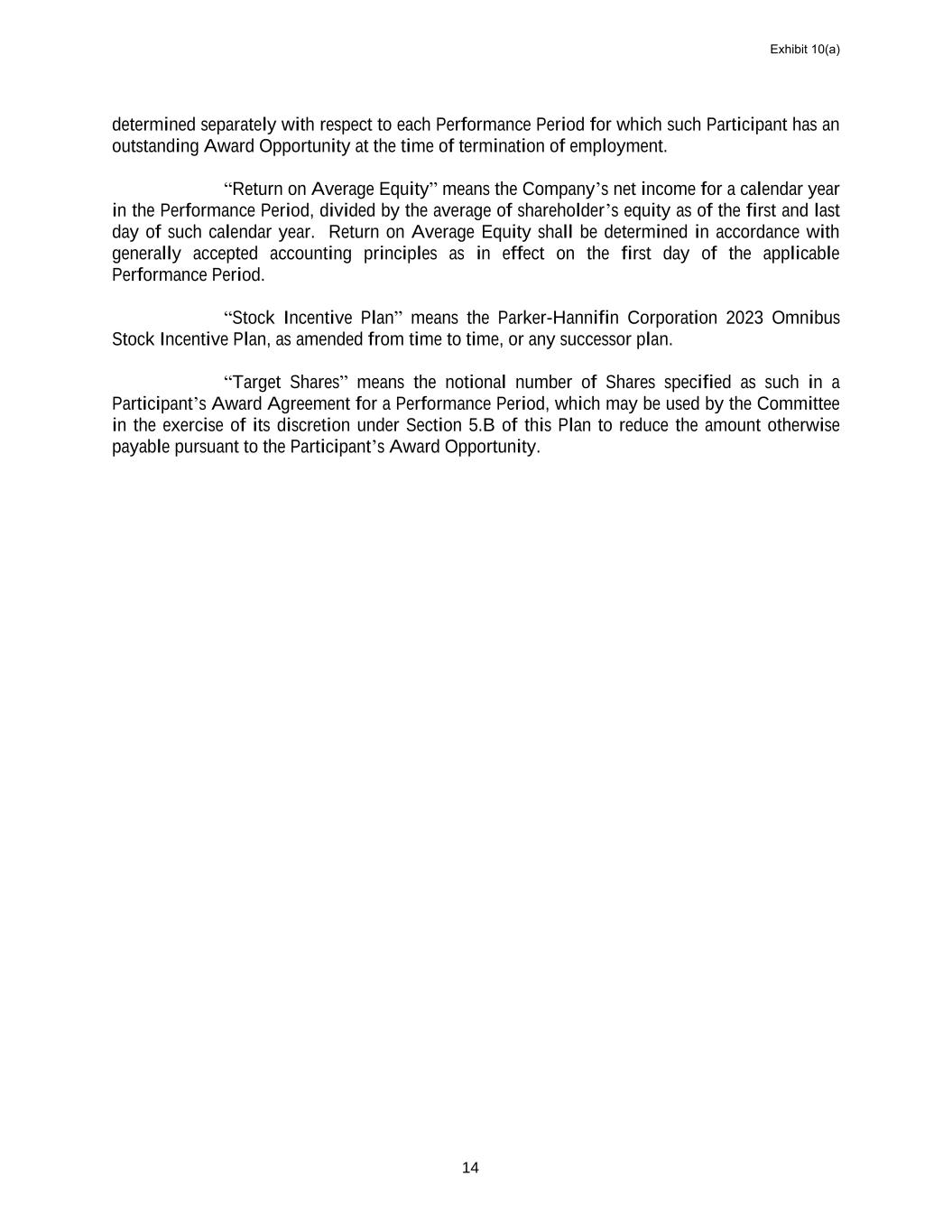 14 determined separately with respect to each Performance Period for which such Participant has an outstanding Award Opportunity at the time of termination of employment. “Return on Average Equity” means the Company’s net income for a calendar year in the Performance Period, divided by the average of shareholder’s equity as of the first and last day of such calendar year. Return on Average Equity shall be determined in accordance with generally accepted accounting principles as in effect on the first day of the applicable Performance Period. “Stock Incentive Plan” means the Parker-Hannifin Corporation 2023 Omnibus Stock Incentive Plan, as amended from time to time, or any successor plan. “Target Shares” means the notional number of Shares specified as such in a Participant’s Award Agreement for a Performance Period, which may be used by the Committee in the exercise of its discretion under Section 5.B of this Plan to reduce the amount otherwise payable pursuant to the Participant’s Award Opportunity. Exhibit 10(a)