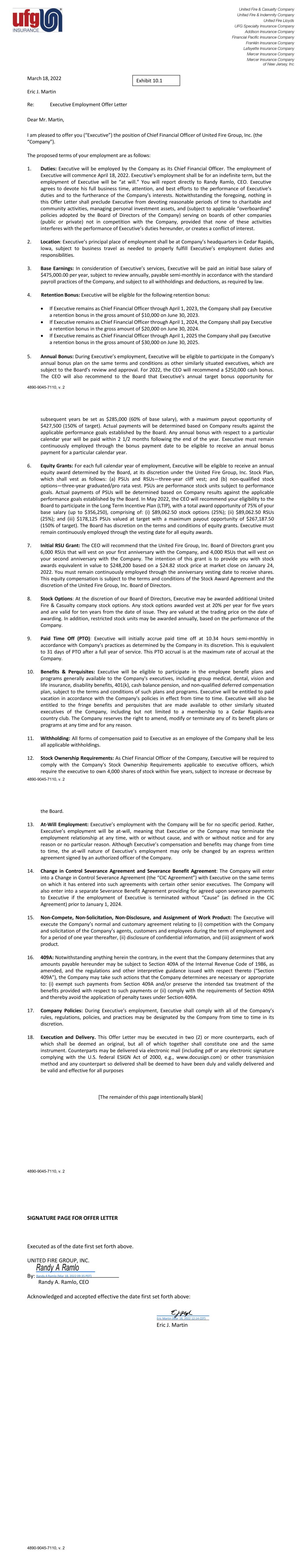 4890-9045-7110, v. 2 March 18, 2022 Eric J. Martin Re: Executive Employment Offer Letter Dear Mr. Martin, I am pleased to offer you (“Executive”) the position of Chief Financial Officer of United Fire Group, Inc. (the “Company”). The proposed terms of your employment are as follows: 1. Duties: Executive will be employed by the Company as its Chief Financial Officer. The employment of Executive will commence April 18, 2022. Executive’s employment shall be for an indefinite term, but the employment of Executive will be “at will.” You will report directly to Randy Ramlo, CEO. Executive agrees to devote his full business time, attention, and best efforts to the performance of Executive’s duties and to the furtherance of the Company's interests. Notwithstanding the foregoing, nothing in this Offer Letter shall preclude Executive from devoting reasonable periods of time to charitable and community activities, managing personal investment assets, and (subject to applicable “overboarding” policies adopted by the Board of Directors of the Company) serving on boards of other companies (public or private) not in competition with the Company, provided that none of these activities interferes with the performance of Executive’s duties hereunder, or creates a conflict of interest. 2. Location: Executive’s principal place of employment shall be at Company’s headquarters in Cedar Rapids, Iowa, subject to business travel as needed to properly fulfill Executive’s employment duties and responsibilities. 3. Base Earnings: In consideration of Executive’s services, Executive will be paid an initial base salary of $475,000.00 per year, subject to review annually, payable semi-monthly in accordance with the standard payroll practices of the Company, and subject to all withholdings and deductions, as required by law. 4. Retention Bonus: Executive will be eligible for the following retention bonus: • If Executive remains as Chief Financial Officer through April 1, 2023, the Company shall pay Executive a retention bonus in the gross amount of $10,000 on June 30, 2023. • If Executive remains as Chief Financial Officer through April 1, 2024, the Company shall pay Executive a retention bonus in the gross amount of $20,000 on June 30, 2024. • If Executive remains as Chief Financial Officer through April 1, 2025 the Company shall pay Executive a retention bonus in the gross amount of $30,000 on June 30, 2025. 5. Annual Bonus: During Executive’s employment, Executive will be eligible to participate in the Company's annual bonus plan on the same terms and conditions as other similarly situated executives, which are subject to the Board’s review and approval. For 2022, the CEO will recommend a $250,000 cash bonus. The CEO will also recommend to the Board that Executive's annual target bonus opportunity for Exhibit 10.1 4890-9045-7110, v. 2 subsequent years be set as $285,000 (60% of base salary), with a maximum payout opportunity of $427,500 (150% of target). Actual payments will be determined based on Company results against the applicable performance goals established by the Board. Any annual bonus with respect to a particular calendar year will be paid within 2 1/2 months following the end of the year. Executive must remain continuously employed through the bonus payment date to be eligible to receive an annual bonus payment for a particular calendar year. 6. Equity Grants: For each full calendar year of employment, Executive will be eligible to receive an annual equity award determined by the Board, at its discretion under the United Fire Group, Inc. Stock Plan, which shall vest as follows: (a) PSUs and RSUs—three-year cliff vest; and (b) non-qualified stock options—three-year graduated/pro rata vest. PSUs are performance stock units subject to performance goals. Actual payments of PSUs will be determined based on Company results against the applicable performance goals established by the Board. In May 2022, the CEO will recommend your eligibility to the Board to participate in the Long Term Incentive Plan (LTIP), with a total award opportunity of 75% of your base salary (up to $356,250), comprising of: (i) $89,062.50 stock options (25%); (ii) $89,062.50 RSUs (25%); and (iii) $178,125 PSUs valued at target with a maximum payout opportunity of $267,187.50 (150% of target). The Board has discretion on the terms and conditions of equity grants. Executive must remain continuously employed through the vesting date for all equity awards. 7. Initial RSU Grant: The CEO will recommend that the United Fire Group, Inc. Board of Directors grant you 6,000 RSUs that will vest on your first anniversary with the Company, and 4,000 RSUs that will vest on your second anniversary with the Company. The intention of this grant is to provide you with stock awards equivalent in value to $248,200 based on a $24.82 stock price at market close on January 24, 2022. You must remain continuously employed through the anniversary vesting date to receive shares. This equity compensation is subject to the terms and conditions of the Stock Award Agreement and the discretion of the United Fire Group, Inc. Board of Directors. 8. Stock Options: At the discretion of our Board of Directors, Executive may be awarded additional United Fire & Casualty company stock options. Any stock options awarded vest at 20% per year for five years and are valid for ten years from the date of issue. They are valued at the trading price on the date of awarding. In addition, restricted stock units may be awarded annually, based on the performance of the Company. 9. Paid Time Off (PTO): Executive will initially accrue paid time off at 10.34 hours semi-monthly in accordance with Company’s practices as determined by the Company in its discretion. This is equivalent to 31 days of PTO after a full year of service. This PTO accrual is at the maximum rate of accrual at the Company. 10. Benefits & Perquisites: Executive will be eligible 