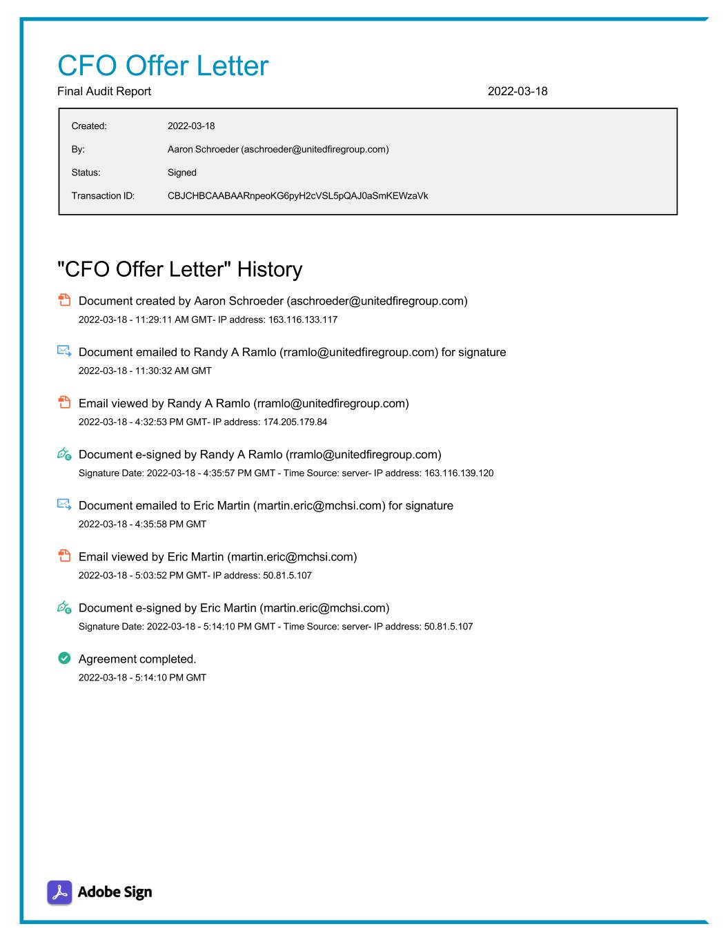 Created: 2022-03-18 By: Status: Transaction ID: Aaron Schroeder (aschroeder@unitedfiregroup.com) Signed CBJCHBCAABAARnpeoKG6pyH2cVSL5pQAJ0aSmKEWzaVk CFO Offer Letter Final Audit Report 2022-03-18 "CFO Offer Letter" History Document created by Aaron Schroeder (aschroeder@unitedfiregroup.com) 2022-03-18 - 11:29:11 AM GMT- IP address: 163.116.133.117 Document emailed to Randy A Ramlo (rramlo@unitedfiregroup.com) for signature 2022-03-18 - 11:30:32 AM GMT Email viewed by Randy A Ramlo (rramlo@unitedfiregroup.com) 2022-03-18 - 4:32:53 PM GMT- IP address: 174.205.179.84 Document e-signed by Randy A Ramlo (rramlo@unitedfiregroup.com) Signature Date: 2022-03-18 - 4:35:57 PM GMT - Time Source: server- IP address: 163.116.139.120 Document emailed to Eric Martin (martin.eric@mchsi.com) for signature 2022-03-18 - 4:35:58 PM GMT Email viewed by Eric Martin (martin.eric@mchsi.com) 2022-03-18 - 5:03:52 PM GMT- IP address: 50.81.5.107 Document e-signed by Eric Martin (martin.eric@mchsi.com) Signature Date: 2022-03-18 - 5:14:10 PM GMT - Time Source: server- IP address: 50.81.5.107 Agreement completed. 2022-03-18 - 5:14:10 PM GMT