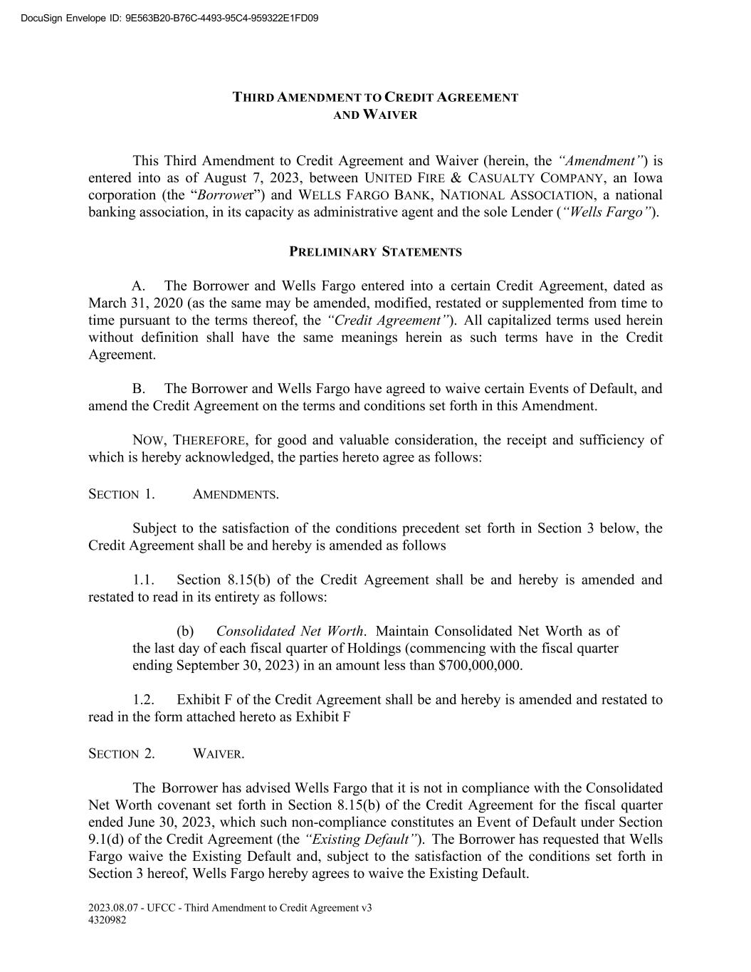 DocuSign Envelope ID: 9E563B20-B76C-4493-95C4-959322E1FD09 THIRD AMENDMENT TO CREDIT AGREEMENT AND WAIVER This Third Amendment to Credit Agreement and Waiver (herein, the “Amendment”) is entered into as of August 7, 2023, between UNITED FIRE & CASUALTY COMPANY, an Iowa corporation (the “Borrower”) and WELLS FARGO BANK, NATIONAL ASSOCIATION, a national banking association, in its capacity as administrative agent and the sole Lender (“Wells Fargo”). PRELIMINARY STATEMENTS A. The Borrower and Wells Fargo entered into a certain Credit Agreement, dated as March 31, 2020 (as the same may be amended, modified, restated or supplemented from time to time pursuant to the terms thereof, the “Credit Agreement”). All capitalized terms used herein without definition shall have the same meanings herein as such terms have in the Credit Agreement. B. The Borrower and Wells Fargo have agreed to waive certain Events of Default, and amend the Credit Agreement on the terms and conditions set forth in this Amendment. NOW, THEREFORE, for good and valuable consideration, the receipt and sufficiency of which is hereby acknowledged, the parties hereto agree as follows: SECTION 1. AMENDMENTS. Subject to the satisfaction of the conditions precedent set forth in Section 3 below, the Credit Agreement shall be and hereby is amended as follows 1.1. Section 8.15(b) of the Credit Agreement shall be and hereby is amended and restated to read in its entirety as follows: (b) Consolidated Net Worth. Maintain Consolidated Net Worth as of the last day of each fiscal quarter of Holdings (commencing with the fiscal quarter ending September 30, 2023) in an amount less than $700,000,000. 1.2. Exhibit F of the Credit Agreement shall be and hereby is amended and restated to read in the form attached hereto as Exhibit F SECTION 2. WAIVER. The Borrower has advised Wells Fargo that it is not in compliance with the Consolidated Net Worth covenant set forth in Section 8.15(b) of the Credit Agreement for the fiscal quarter ended June 30, 2023, which such non-compliance constitutes an Event of Default under Section 9.1(d) of the Credit Agreement (the “Existing Default”). The Borrower has requested that Wells Fargo waive the Existing Default and, subject to the satisfaction of the conditions set forth in Section 3 hereof, Wells Fargo hereby agrees to waive the Existing Default. 2023.08.07 - UFCC - Third Amendment to Credit Agreement v3 4320982