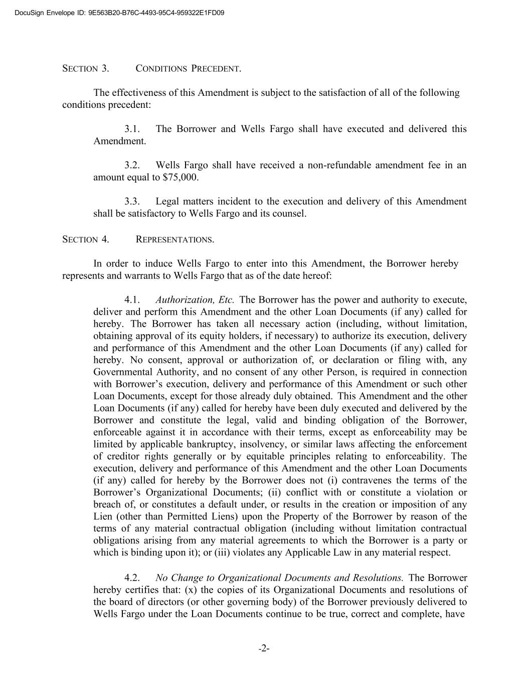 DocuSign Envelope ID: 9E563B20-B76C-4493-95C4-959322E1FD09 -2- SECTION 3. CONDITIONS PRECEDENT. The effectiveness of this Amendment is subject to the satisfaction of all of the following conditions precedent: 3.1. The Borrower and Wells Fargo shall have executed and delivered this Amendment. 3.2. Wells Fargo shall have received a non-refundable amendment fee in an amount equal to $75,000. 3.3. Legal matters incident to the execution and delivery of this Amendment shall be satisfactory to Wells Fargo and its counsel. SECTION 4. REPRESENTATIONS. In order to induce Wells Fargo to enter into this Amendment, the Borrower hereby represents and warrants to Wells Fargo that as of the date hereof: 4.1. Authorization, Etc. The Borrower has the power and authority to execute, deliver and perform this Amendment and the other Loan Documents (if any) called for hereby. The Borrower has taken all necessary action (including, without limitation, obtaining approval of its equity holders, if necessary) to authorize its execution, delivery and performance of this Amendment and the other Loan Documents (if any) called for hereby. No consent, approval or authorization of, or declaration or filing with, any Governmental Authority, and no consent of any other Person, is required in connection with Borrower’s execution, delivery and performance of this Amendment or such other Loan Documents, except for those already duly obtained. This Amendment and the other Loan Documents (if any) called for hereby have been duly executed and delivered by the Borrower and constitute the legal, valid and binding obligation of the Borrower, enforceable against it in accordance with their terms, except as enforceability may be limited by applicable bankruptcy, insolvency, or similar laws affecting the enforcement of creditor rights generally or by equitable principles relating to enforceability. The execution, delivery and performance of this Amendment and the other Loan Documents (if any) called for hereby by the Borrower does not (i) contravenes the terms of the Borrower’s Organizational Documents; (ii) conflict with or constitute a violation or breach of, or constitutes a default under, or results in the creation or imposition of any Lien (other than Permitted Liens) upon the Property of the Borrower by reason of the terms of any material contractual obligation (including without limitation contractual obligations arising from any material agreements to which the Borrower is a party or which is binding upon it); or (iii) violates any Applicable Law in any material respect. 4.2. No Change to Organizational Documents and Resolutions. The Borrower hereby certifies that: (x) the copies of its Organizational Documents and resolutions of the board of directors (or other governing body) of the Borrower previously delivered to Wells Fargo under the Loan Documents continue to be true, correct and complete, have