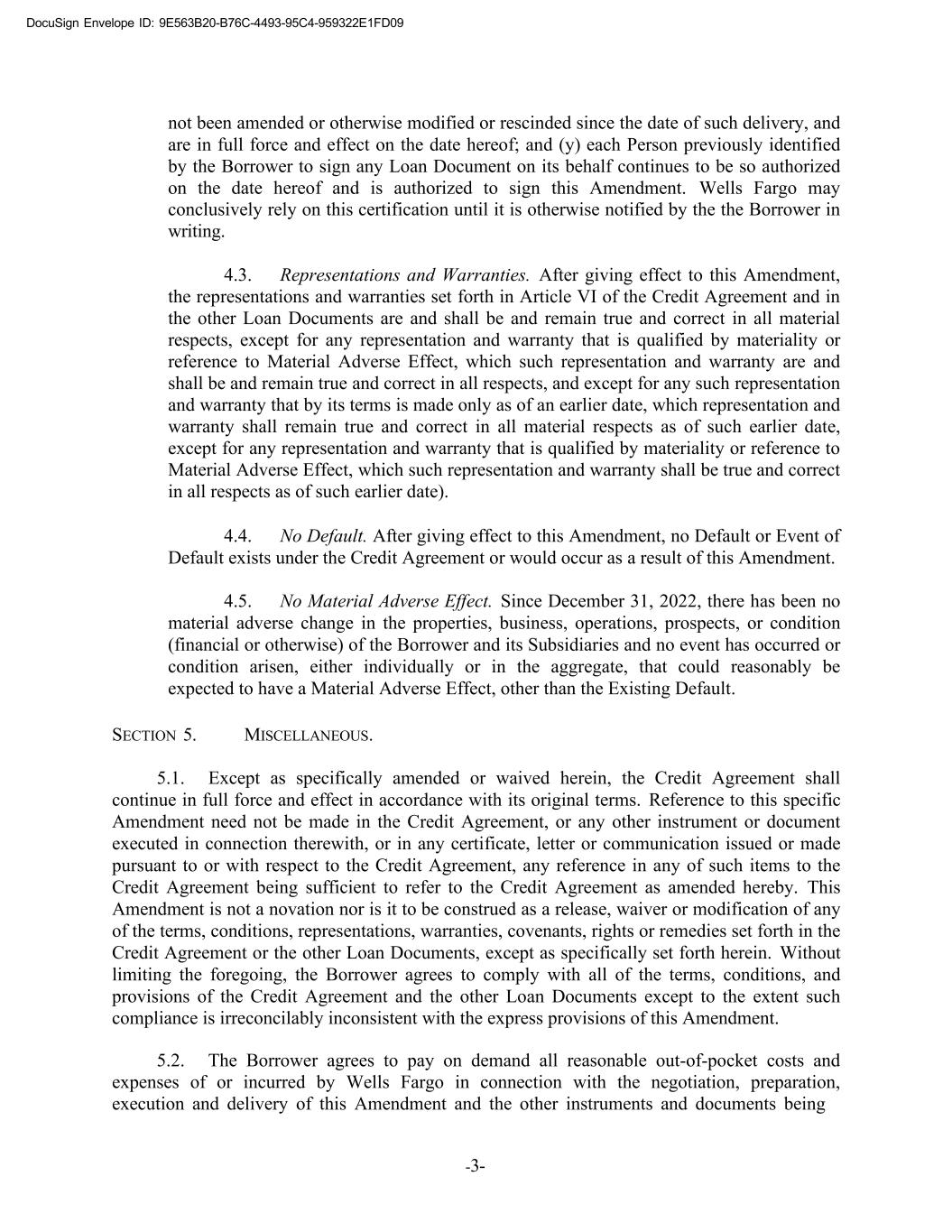 DocuSign Envelope ID: 9E563B20-B76C-4493-95C4-959322E1FD09 -3- not been amended or otherwise modified or rescinded since the date of such delivery, and are in full force and effect on the date hereof; and (y) each Person previously identified by the Borrower to sign any Loan Document on its behalf continues to be so authorized on the date hereof and is authorized to sign this Amendment. Wells Fargo may conclusively rely on this certification until it is otherwise notified by the the Borrower in writing. 4.3. Representations and Warranties. After giving effect to this Amendment, the representations and warranties set forth in Article VI of the Credit Agreement and in the other Loan Documents are and shall be and remain true and correct in all material respects, except for any representation and warranty that is qualified by materiality or reference to Material Adverse Effect, which such representation and warranty are and shall be and remain true and correct in all respects, and except for any such representation and warranty that by its terms is made only as of an earlier date, which representation and warranty shall remain true and correct in all material respects as of such earlier date, except for any representation and warranty that is qualified by materiality or reference to Material Adverse Effect, which such representation and warranty shall be true and correct in all respects as of such earlier date). 4.4. No Default. After giving effect to this Amendment, no Default or Event of Default exists under the Credit Agreement or would occur as a result of this Amendment. 4.5. No Material Adverse Effect. Since December 31, 2022, there has been no material adverse change in the properties, business, operations, prospects, or condition (financial or otherwise) of the Borrower and its Subsidiaries and no event has occurred or condition arisen, either individually or in the aggregate, that could reasonably be expected to have a Material Adverse Effect, other than the Existing Default. SECTION 5. MISCELLANEOUS. 5.1. Except as specifically amended or waived herein, the Credit Agreement shall continue in full force and effect in accordance with its original terms. Reference to this specific Amendment need not be made in the Credit Agreement, or any other instrument or document executed in connection therewith, or in any certificate, letter or communication issued or made pursuant to or with respect to the Credit Agreement, any reference in any of such items to the Credit Agreement being sufficient to refer to the Credit Agreement as amended hereby. This Amendment is not a novation nor is it to be construed as a release, waiver or modification of any of the terms, conditions, representations, warranties, covenants, rights or remedies set forth in the Credit Agreement or the other Loan Documents, except as specifically set forth herein. Without limiting the foregoing, the Borrower agrees to comply with all of the terms, conditions, and provisions of the Credit Agreement and the other Loan Documents except to the extent such compliance is irreconcilably inconsistent with the express provisions of this Amendment. 5.2. The Borrower agrees to pay on demand all reasonable out-of-pocket costs and expenses of or incurred by Wells Fargo in connection with the negotiation, preparation, execution and delivery of this Amendment and the other instruments and documents being