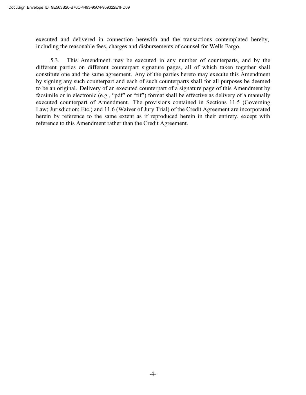 DocuSign Envelope ID: 9E563B20-B76C-4493-95C4-959322E1FD09 -4- executed and delivered in connection herewith and the transactions contemplated hereby, including the reasonable fees, charges and disbursements of counsel for Wells Fargo. 5.3. This Amendment may be executed in any number of counterparts, and by the different parties on different counterpart signature pages, all of which taken together shall constitute one and the same agreement. Any of the parties hereto may execute this Amendment by signing any such counterpart and each of such counterparts shall for all purposes be deemed to be an original. Delivery of an executed counterpart of a signature page of this Amendment by facsimile or in electronic (e.g., “pdf” or “tif”) format shall be effective as delivery of a manually executed counterpart of Amendment. The provisions contained in Sections 11.5 (Governing Law; Jurisdiction; Etc.) and 11.6 (Waiver of Jury Trial) of the Credit Agreement are incorporated herein by reference to the same extent as if reproduced herein in their entirety, except with reference to this Amendment rather than the Credit Agreement.