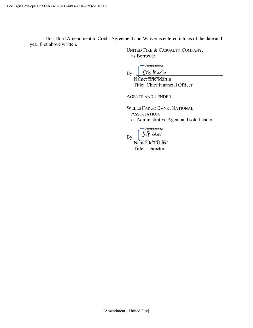 DocuSign Envelope ID: 9E563B20-B76C-4493-95C4-959322E1FD09 [Amendment – United Fire] This Third Amendment to Credit Agreement and Waiver is entered into as of the date and year first above written. UNITED FIRE & CASUALTY COMPANY, as Borrower By: Name: Eric Martin Title: Chief Financial Officer AGENTS AND LENDER: WELLS FARGO BANK, NATIONAL ASSOCIATION, as Administrative Agent and sole Lender By: Name: Jeff Glas Title: Director