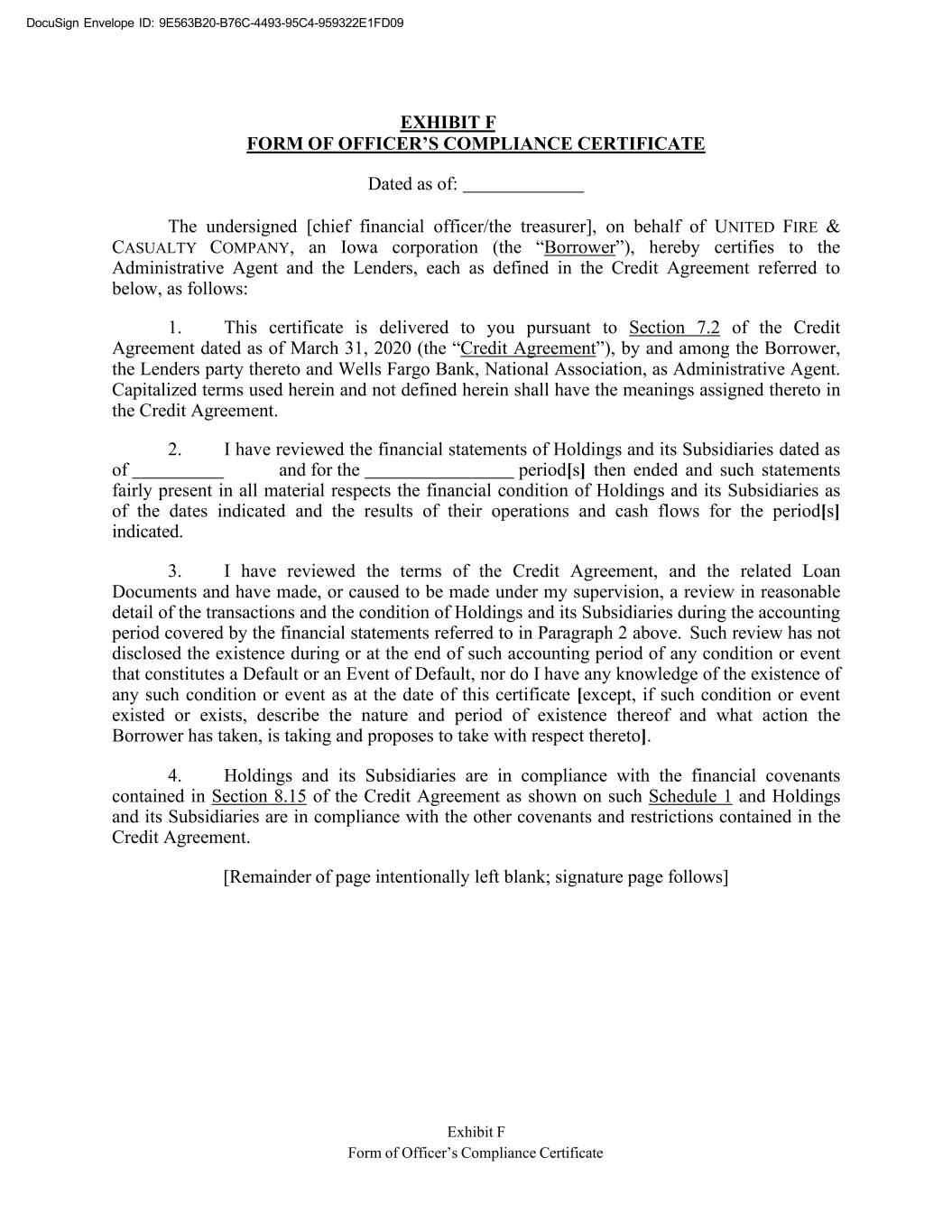 DocuSign Envelope ID: 9E563B20-B76C-4493-95C4-959322E1FD09 Exhibit F Form of Officer’s Compliance Certificate EXHIBIT F FORM OF OFFICER’S COMPLIANCE CERTIFICATE Dated as of: The undersigned [chief financial officer/the treasurer], on behalf of UNITED FIRE & CASUALTY COMPANY, an Iowa corporation (the “Borrower”), hereby certifies to the Administrative Agent and the Lenders, each as defined in the Credit Agreement referred to below, as follows: 1. This certificate is delivered to you pursuant to Section 7.2 of the Credit Agreement dated as of March 31, 2020 (the “Credit Agreement”), by and among the Borrower, the Lenders party thereto and Wells Fargo Bank, National Association, as Administrative Agent. Capitalized terms used herein and not defined herein shall have the meanings assigned thereto in the Credit Agreement. 2. I have reviewed the financial statements of Holdings and its Subsidiaries dated as of and for the period[s] then ended and such statements fairly present in all material respects the financial condition of Holdings and its Subsidiaries as of the dates indicated and the results of their operations and cash flows for the period[s] indicated. 3. I have reviewed the terms of the Credit Agreement, and the related Loan Documents and have made, or caused to be made under my supervision, a review in reasonable detail of the transactions and the condition of Holdings and its Subsidiaries during the accounting period covered by the financial statements referred to in Paragraph 2 above. Such review has not disclosed the existence during or at the end of such accounting period of any condition or event that constitutes a Default or an Event of Default, nor do I have any knowledge of the existence of any such condition or event as at the date of this certificate [except, if such condition or event existed or exists, describe the nature and period of existence thereof and what action the Borrower has taken, is taking and proposes to take with respect thereto]. 4. Holdings and its Subsidiaries are in compliance with the financial covenants contained in Section 8.15 of the Credit Agreement as shown on such Schedule 1 and Holdings and its Subsidiaries are in compliance with the other covenants and restrictions contained in the Credit Agreement. [Remainder of page intentionally left blank; signature page follows]