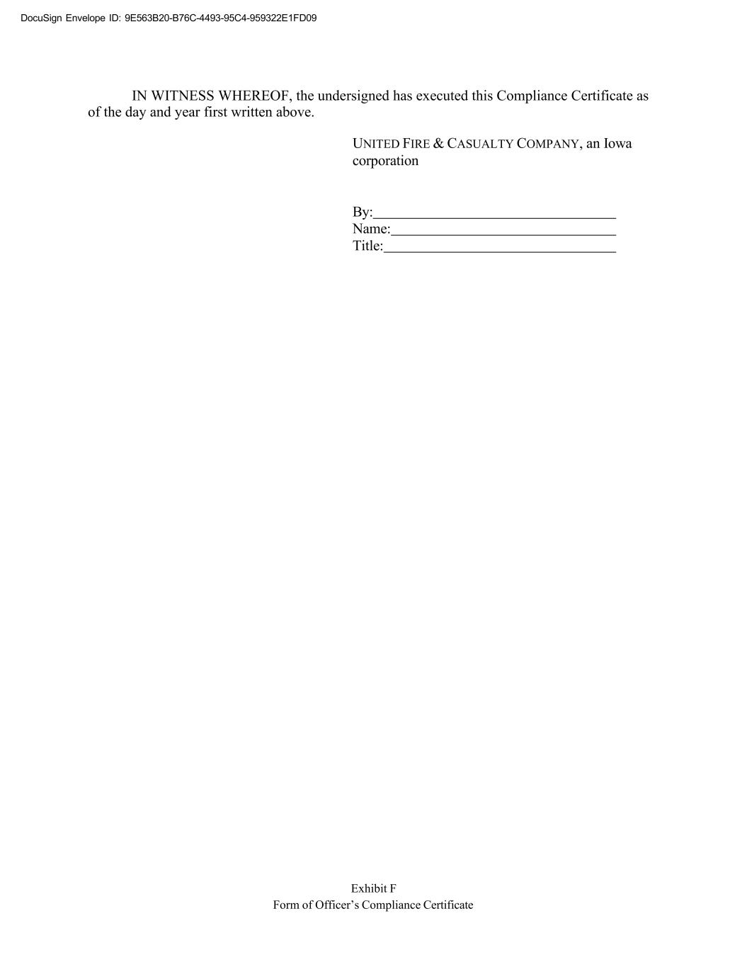 DocuSign Envelope ID: 9E563B20-B76C-4493-95C4-959322E1FD09 Exhibit F Form of Officer’s Compliance Certificate IN WITNESS WHEREOF, the undersigned has executed this Compliance Certificate as of the day and year first written above. UNITED FIRE & CASUALTY COMPANY, an Iowa corporation By: Name: Title: