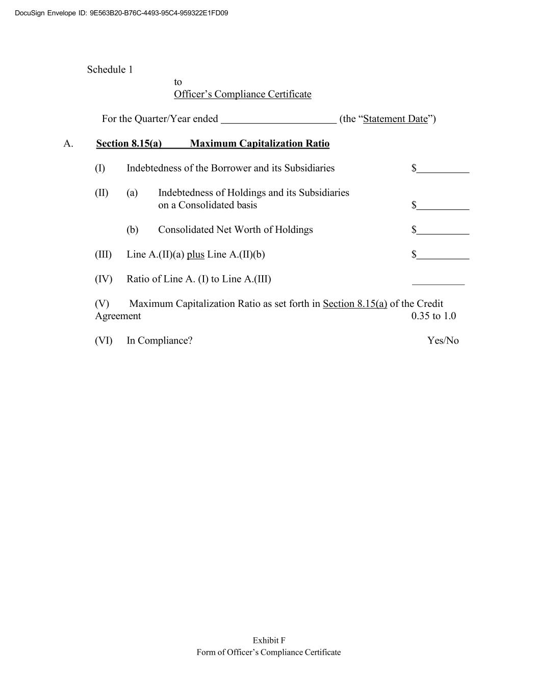 DocuSign Envelope ID: 9E563B20-B76C-4493-95C4-959322E1FD09 Exhibit F Form of Officer’s Compliance Certificate Schedule 1 to Officer’s Compliance Certificate For the Quarter/Year ended (the “Statement Date”) A. Section 8.15(a) Maximum Capitalization Ratio (I) Indebtedness of the Borrower and its Subsidiaries $ (II) (a) Indebtedness of Holdings and its Subsidiaries on a Consolidated basis $ (b) Consolidated Net Worth of Holdings $ (III) Line A.(II)(a) plus Line A.(II)(b) $ (IV) Ratio of Line A. (I) to Line A.(III) (V) Maximum Capitalization Ratio as set forth in Section 8.15(a) of the Credit Agreement 0.35 to 1.0 (VI) In Compliance? Yes/No