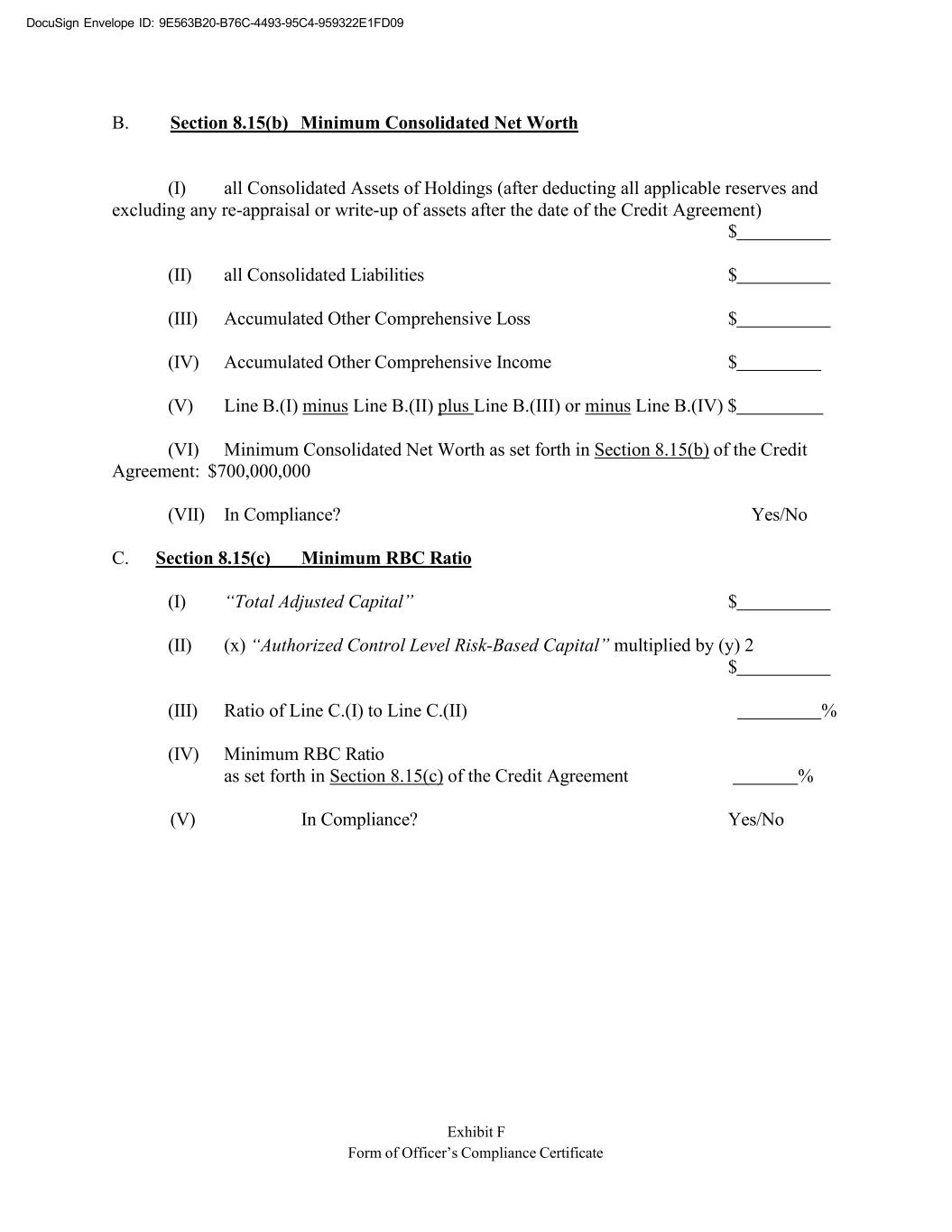 DocuSign Envelope ID: 9E563B20-B76C-4493-95C4-959322E1FD09 Exhibit F Form of Officer’s Compliance Certificate B. Section 8.15(b) Minimum Consolidated Net Worth (I) all Consolidated Assets of Holdings (after deducting all applicable reserves and excluding any re-appraisal or write-up of assets after the date of the Credit Agreement) $ (II) all Consolidated Liabilities $ (III) Accumulated Other Comprehensive Loss $ (IV) Accumulated Other Comprehensive Income $ (V) Line B.(I) minus Line B.(II) plus Line B.(III) or minus Line B.(IV) $ (VI) Minimum Consolidated Net Worth as set forth in Section 8.15(b) of the Credit Agreement: $700,000,000 (VII) In Compliance? Yes/No C. Section 8.15(c) Minimum RBC Ratio (I) “Total Adjusted Capital” $ (II) (x) “Authorized Control Level Risk-Based Capital” multiplied by (y) 2 $ (III) Ratio of Line C.(I) to Line C.(II) % (IV) Minimum RBC Ratio as set forth in Section 8.15(c) of the Credit Agreement % (V) In Compliance? Yes/No