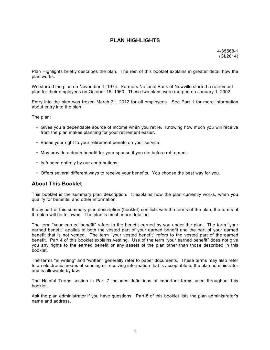 1 PLAN HIGHLIGHTS 4-35568-1 (CL2014) Plan Highlights briefly describes the plan. The rest of this booklet explains in greater detail how the plan works. We started the plan on November 1, 1974. Farmers National Bank of Newville started a retirement plan for their employees on October 15, 1960. These two plans were merged on January 1, 2002. Entry into the plan was frozen March 31, 2012 for all employees. See Part 1 for more information about entry into the plan. The plan: • Gives you a dependable source of income when you retire. Knowing how much you will receive from the plan makes planning for your retirement easier. • Bases your right to your retirement benefit on your service. • May provide a death benefit for your spouse if you die before retirement. • Is funded entirely by our contributions. • Offers several different ways to receive your benefits. You choose the best way for you. About This Booklet This booklet is the summary plan description. It explains how the plan currently works, when you qualify for benefits, and other information. If any part of this summary plan description (booklet) conflicts with the terms of the plan, the terms of the plan will be followed. The plan is much more detailed. The term “your earned benefit” refers to the benefit earned by you under the plan. The term “your earned benefit” applies to both the vested part of your earned benefit and the part of your earned benefit that is not vested. The term “your vested benefit” refers to the vested part of the earned benefit. Part 4 of this booklet explains vesting. Use of the term “your earned benefit” does not give you any rights to the earned benefit or any assets of the plan other than those described in this booklet. The terms “in writing” and “written” generally refer to paper documents. These terms may also refer to an electronic means of sending or receiving information that is acceptable to the plan administrator and is allowable by law. The Helpful Terms section in Part 7 includes definitions of important terms used throughout this booklet. Ask the plan administrator if you have questions. Part 8 of this booklet lists the plan administrator's name and address.