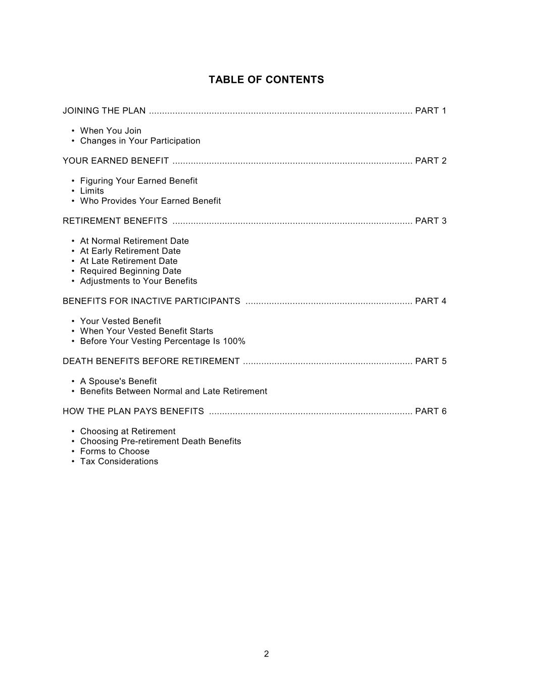 2 TABLE OF CONTENTS JOINING THE PLAN ..................................................................................................... PART 1 • When You Join • Changes in Your Participation YOUR EARNED BENEFIT ............................................................................................ PART 2 • Figuring Your Earned Benefit • Limits • Who Provides Your Earned Benefit RETIREMENT BENEFITS ............................................................................................ PART 3 • At Normal Retirement Date • At Early Retirement Date • At Late Retirement Date • Required Beginning Date • Adjustments to Your Benefits BENEFITS FOR INACTIVE PARTICIPANTS ................................................................ PART 4 • Your Vested Benefit • When Your Vested Benefit Starts • Before Your Vesting Percentage Is 100% DEATH BENEFITS BEFORE RETIREMENT ................................................................. PART 5 • A Spouse's Benefit • Benefits Between Normal and Late Retirement HOW THE PLAN PAYS BENEFITS .............................................................................. PART 6 • Choosing at Retirement • Choosing Pre-retirement Death Benefits • Forms to Choose • Tax Considerations
