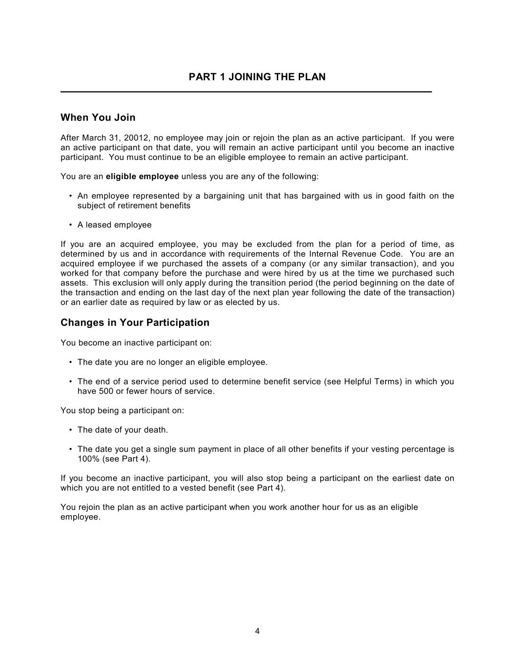 4 PART 1 JOINING THE PLAN When You Join After March 31, 20012, no employee may join or rejoin the plan as an active participant. If you were an active participant on that date, you will remain an active participant until you become an inactive participant. You must continue to be an eligible employee to remain an active participant. You are an eligible employee unless you are any of the following: • An employee represented by a bargaining unit that has bargained with us in good faith on the subject of retirement benefits • A leased employee If you are an acquired employee, you may be excluded from the plan for a period of time, as determined by us and in accordance with requirements of the Internal Revenue Code. You are an acquired employee if we purchased the assets of a company (or any similar transaction), and you worked for that company before the purchase and were hired by us at the time we purchased such assets. This exclusion will only apply during the transition period (the period beginning on the date of the transaction and ending on the last day of the next plan year following the date of the transaction) or an earlier date as required by law or as elected by us. Changes in Your Participation You become an inactive participant on: • The date you are no longer an eligible employee. • The end of a service period used to determine benefit service (see Helpful Terms) in which you have 500 or fewer hours of service. You stop being a participant on: • The date of your death. • The date you get a single sum payment in place of all other benefits if your vesting percentage is 100% (see Part 4). If you become an inactive participant, you will also stop being a participant on the earliest date on which you are not entitled to a vested benefit (see Part 4). You rejoin the plan as an active participant when you work another hour for us as an eligible employee.