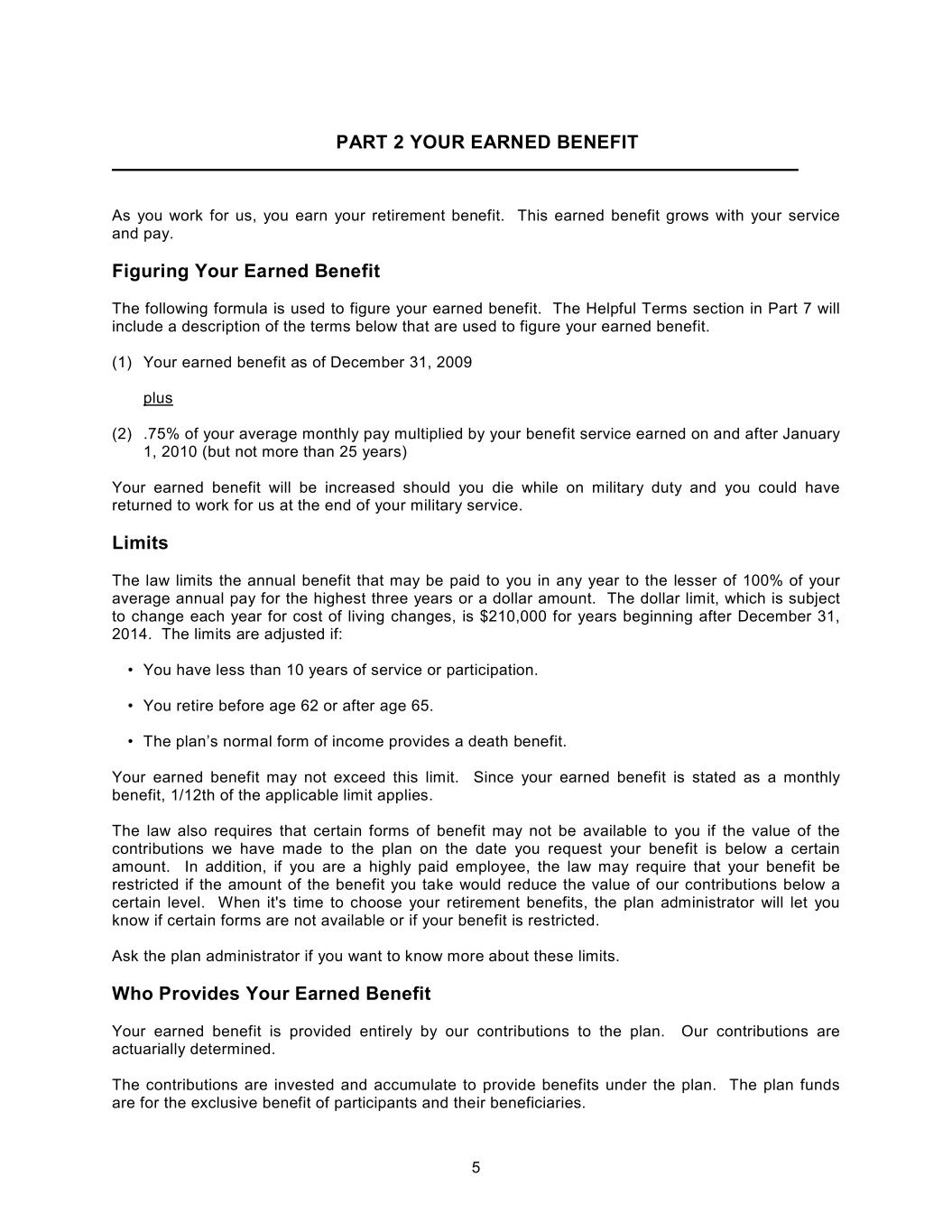 5 PART 2 YOUR EARNED BENEFIT As you work for us, you earn your retirement benefit. This earned benefit grows with your service and pay. Figuring Your Earned Benefit The following formula is used to figure your earned benefit. The Helpful Terms section in Part 7 will include a description of the terms below that are used to figure your earned benefit. (1) Your earned benefit as of December 31, 2009 plus (2) .75% of your average monthly pay multiplied by your benefit service earned on and after January 1, 2010 (but not more than 25 years) Your earned benefit will be increased should you die while on military duty and you could have returned to work for us at the end of your military service. Limits The law limits the annual benefit that may be paid to you in any year to the lesser of 100% of your average annual pay for the highest three years or a dollar amount. The dollar limit, which is subject to change each year for cost of living changes, is $210,000 for years beginning after December 31, 2014. The limits are adjusted if: • You have less than 10 years of service or participation. • You retire before age 62 or after age 65. • The plan’s normal form of income provides a death benefit. Your earned benefit may not exceed this limit. Since your earned benefit is stated as a monthly benefit, 1/12th of the applicable limit applies. The law also requires that certain forms of benefit may not be available to you if the value of the contributions we have made to the plan on the date you request your benefit is below a certain amount. In addition, if you are a highly paid employee, the law may require that your benefit be restricted if the amount of the benefit you take would reduce the value of our contributions below a certain level. When it's time to choose your retirement benefits, the plan administrator will let you know if certain forms are not available or if your benefit is restricted. Ask the plan administrator if you want to know more about these limits. Who Provides Your Earned Benefit Your earned benefit is provided entirely by our contributions to the plan. Our contributions are actuarially determined. The contributions are invested and accumulate to provide benefits under the plan. The plan funds are for the exclusive benefit of participants and their beneficiaries.