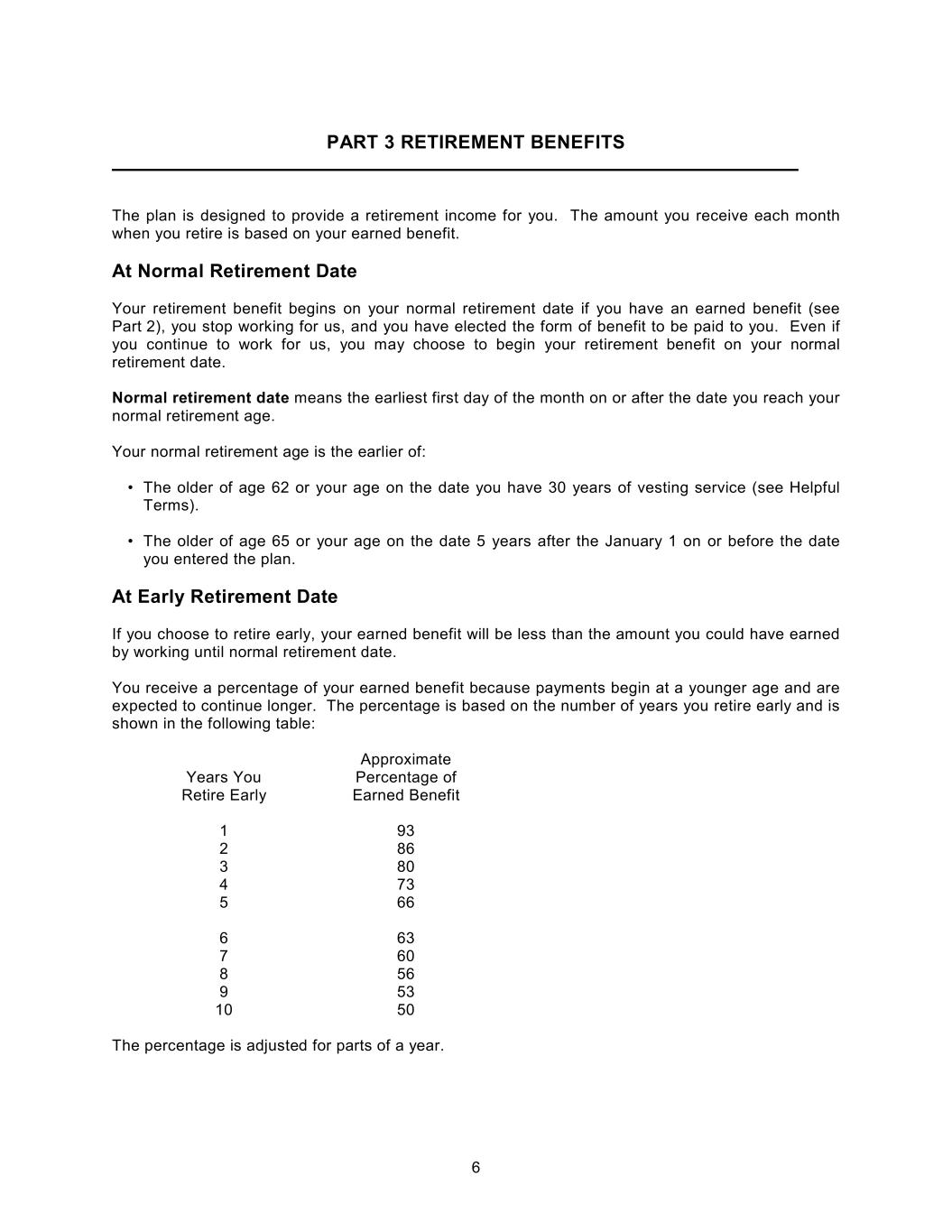 6 PART 3 RETIREMENT BENEFITS The plan is designed to provide a retirement income for you. The amount you receive each month when you retire is based on your earned benefit. At Normal Retirement Date Your retirement benefit begins on your normal retirement date if you have an earned benefit (see Part 2), you stop working for us, and you have elected the form of benefit to be paid to you. Even if you continue to work for us, you may choose to begin your retirement benefit on your normal retirement date. Normal retirement date means the earliest first day of the month on or after the date you reach your normal retirement age. Your normal retirement age is the earlier of: • The older of age 62 or your age on the date you have 30 years of vesting service (see Helpful Terms). • The older of age 65 or your age on the date 5 years after the January 1 on or before the date you entered the plan. At Early Retirement Date If you choose to retire early, your earned benefit will be less than the amount you could have earned by working until normal retirement date. You receive a percentage of your earned benefit because payments begin at a younger age and are expected to continue longer. The percentage is based on the number of years you retire early and is shown in the following table: Approximate Years You Percentage of Retire Early Earned Benefit 1 93 2 86 3 80 4 73 5 66 6 63 7 60 8 56 9 53 10 50 The percentage is adjusted for parts of a year.